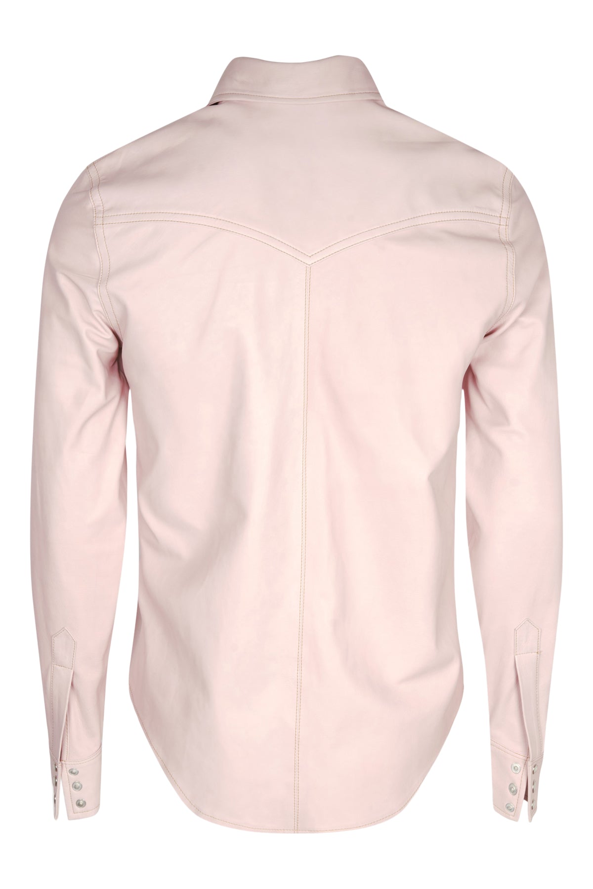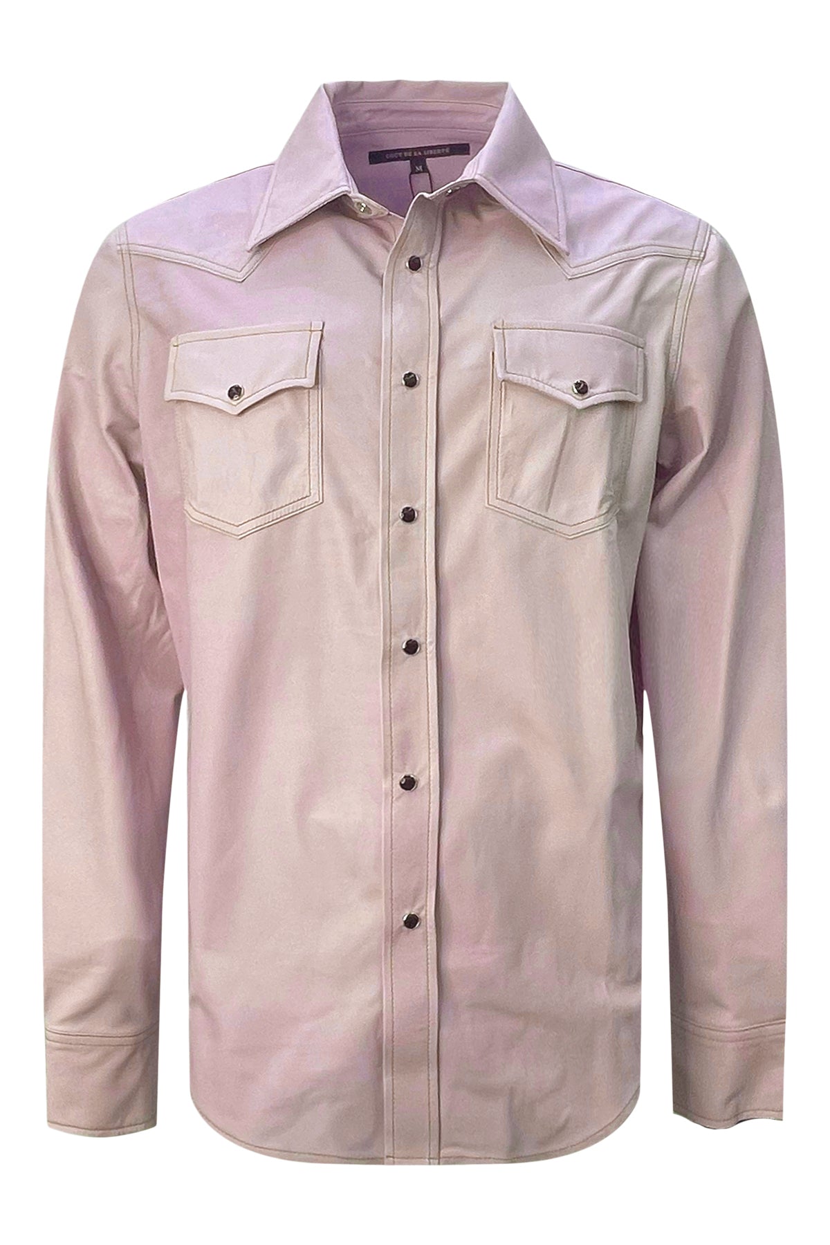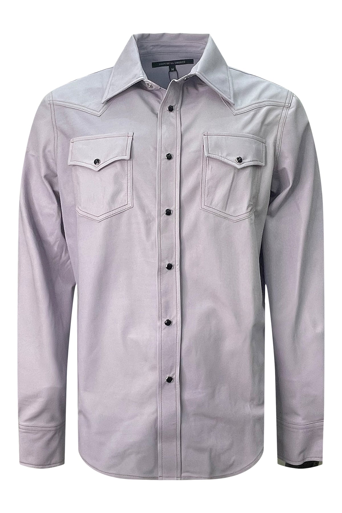 Western Shirt with snap button front closure and snap button flap pockets. Crafted from 100% calfskin for a sleek and luxurious finish. Premium European fabric. Made in the USA.