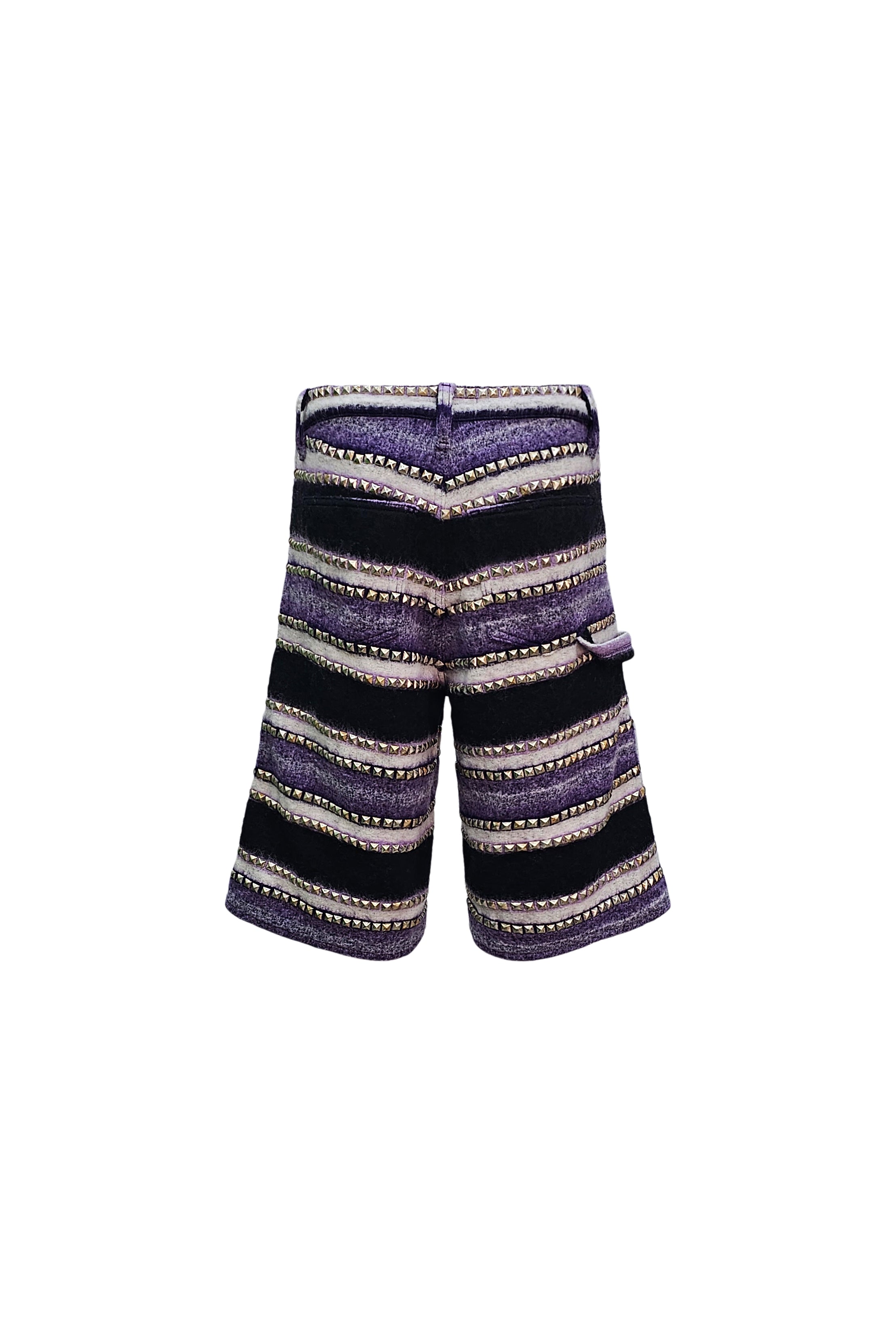 Carpenter Short with button and zip front closure. Embellished for a bold and unique twist on a classic workwear staple. Designed with five-pocket styling for practicality and style. Crafted from a blend of 65% polyester and 35% wool. Premium European fabric. Made in the USA.