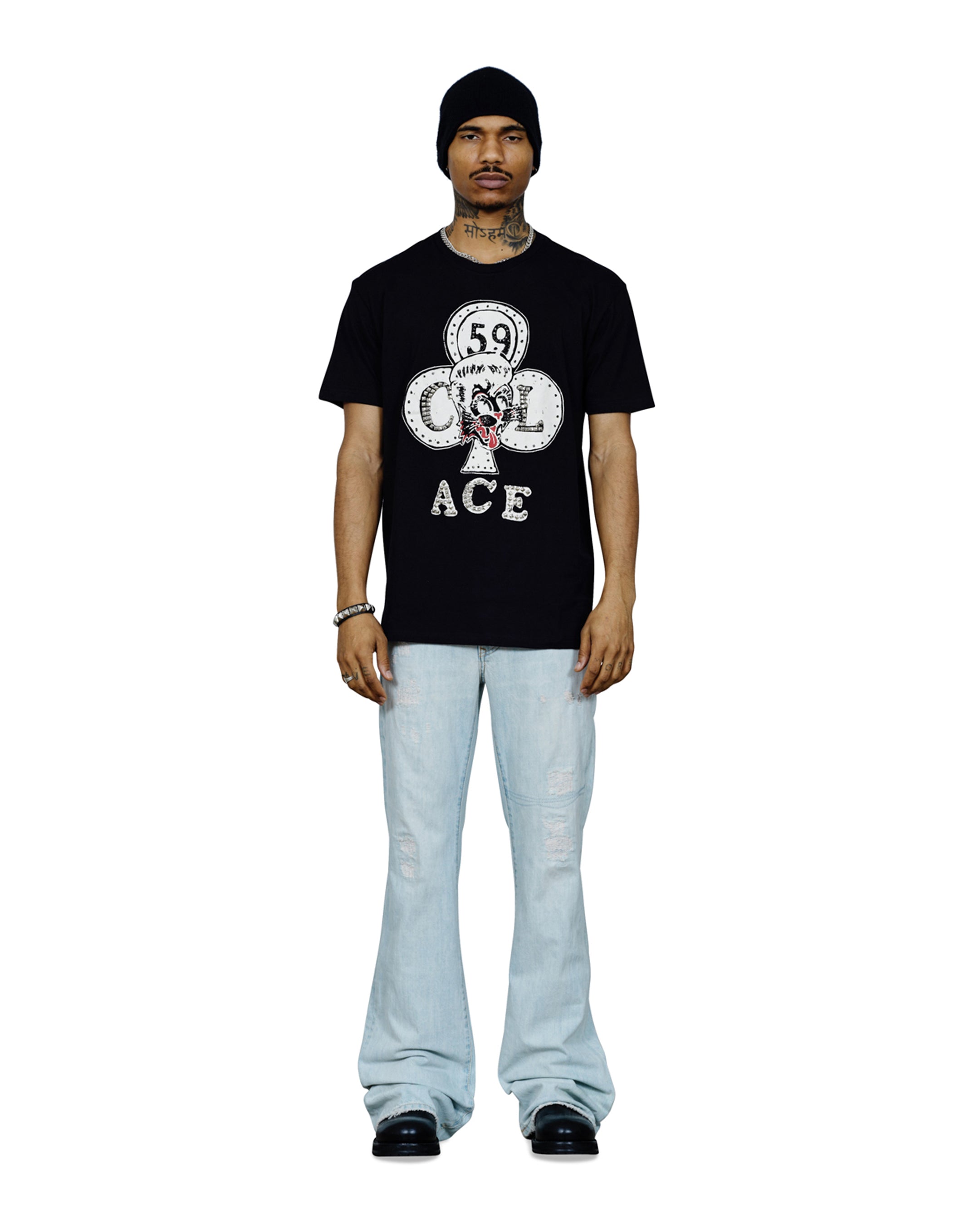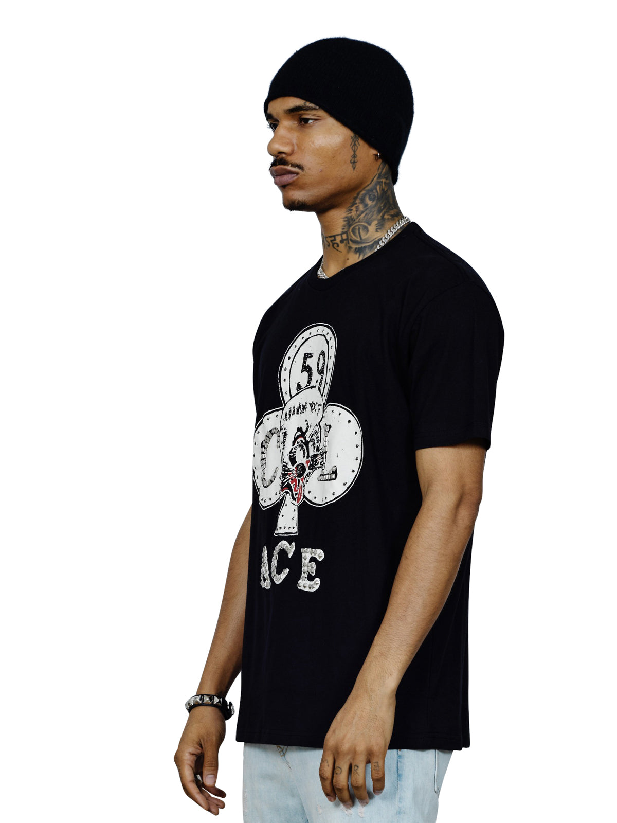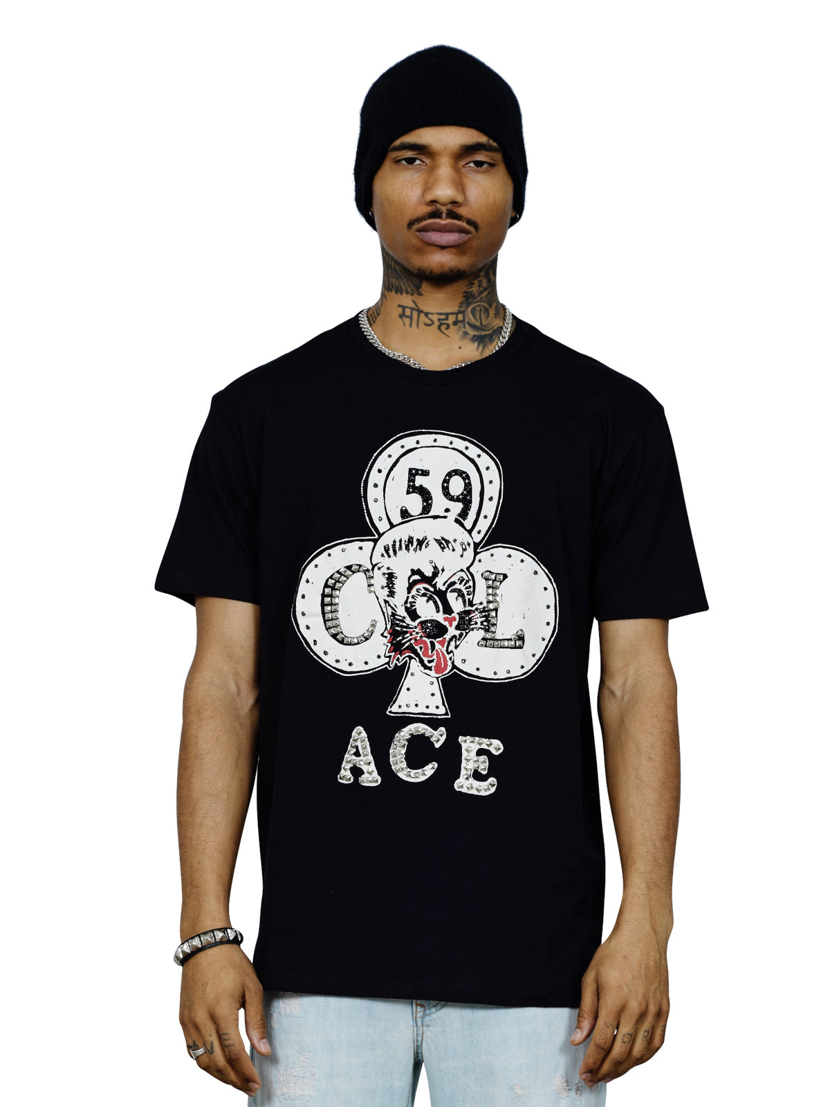 Freddie Crystal-Stud Ace Cat Short Sleeve Tee, crafted from 100% premium cotton for superior comfort and softness. Featuring a bold design accented with crystal studs for a playful yet edgy statement. Made in the USA.