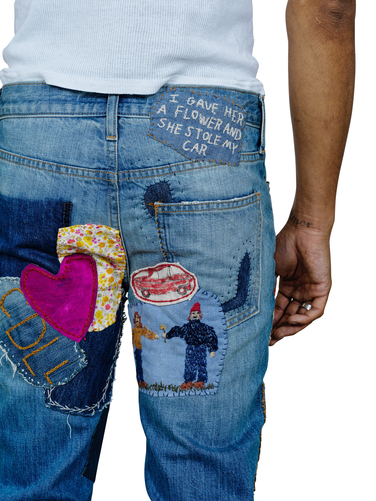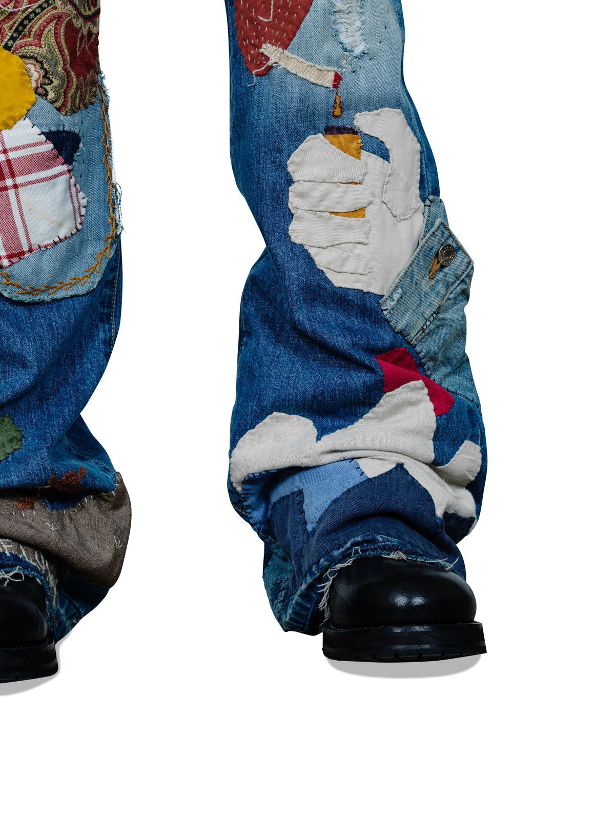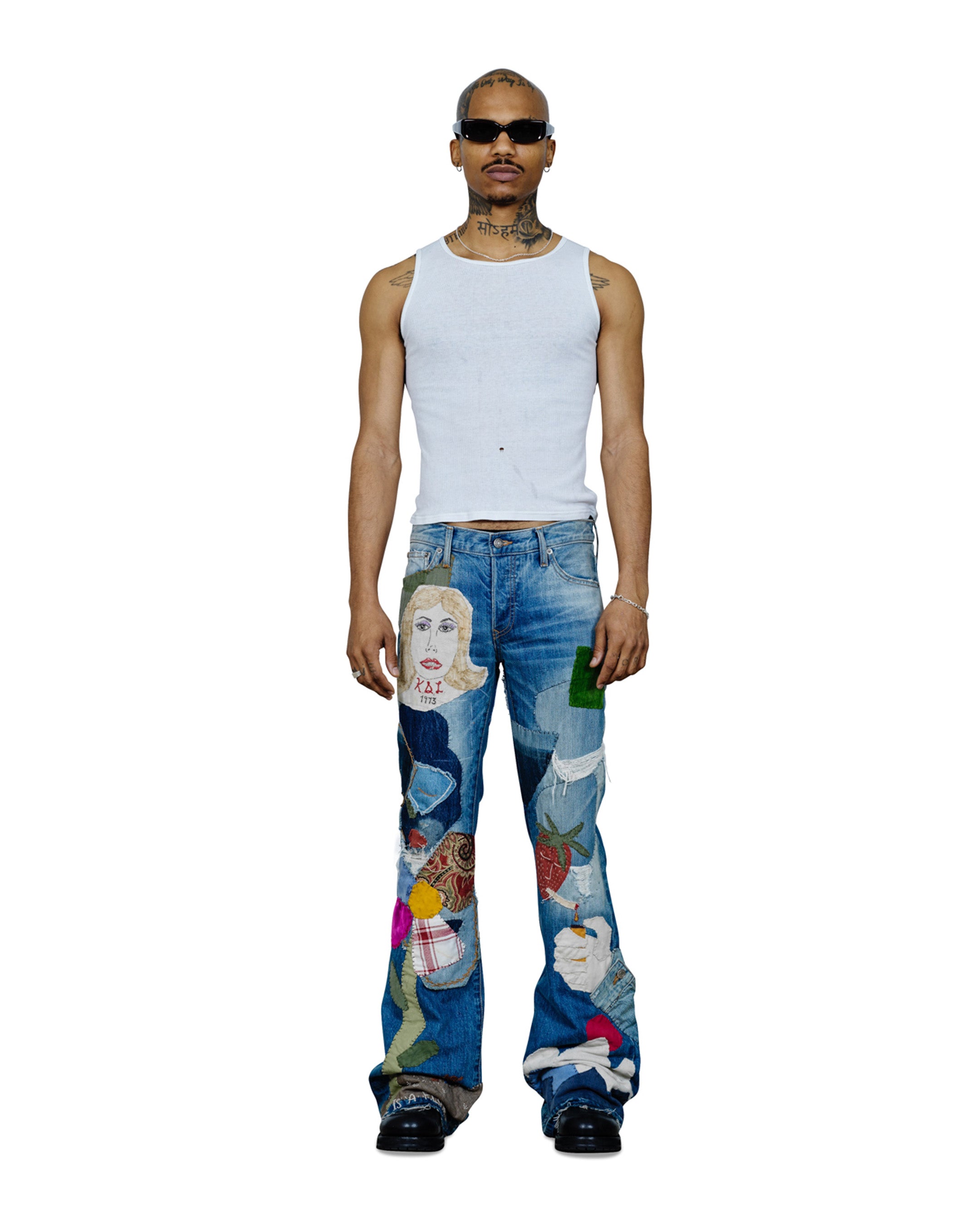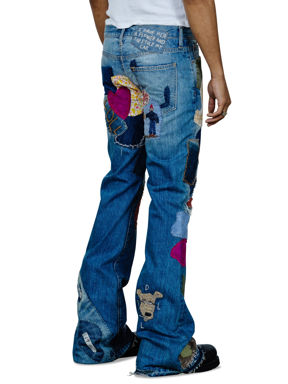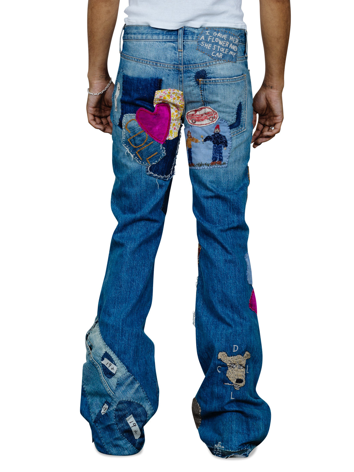 Low-rise flare jeans with button front closure. Crafted from 100% cotton with classic five-pocket styling. Premium European fabric. Each patch is hand cut and hand stitched in Los angeles from vintage fabric. Made in the USA.
