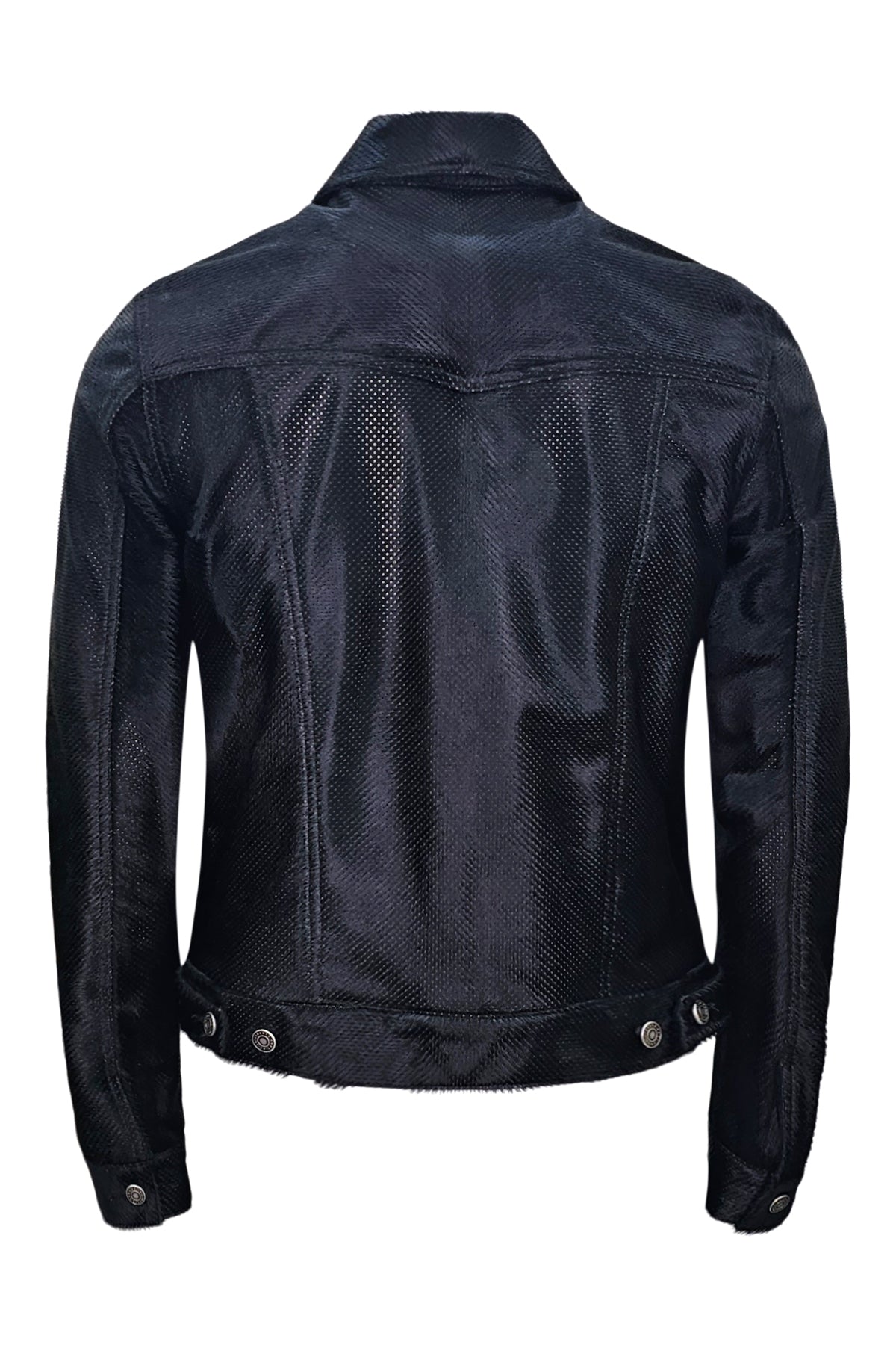 Leather trucker jacket with button and zip front closure for a secure fit. Crafted from 100% premium calfskin with a perforated leather design for a bold, edgy look. Premium European fabric. Made in the USA.