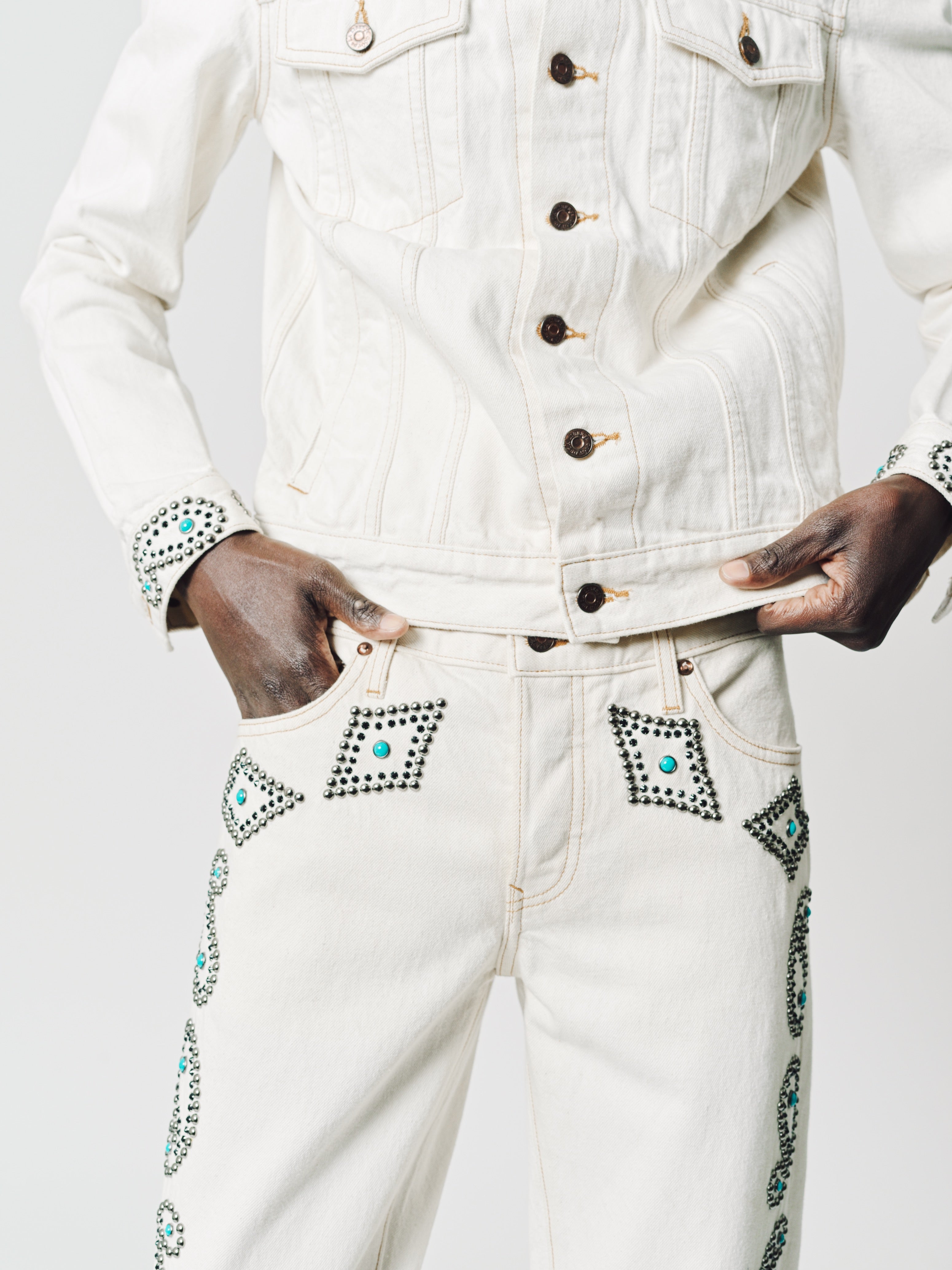 Trucker jacket with button front closure and button flap pockets. Crafted from 100% cotton and adorned with studs and stone embellishments for a bold, standout style. Premium European fabric. Made in the USA.