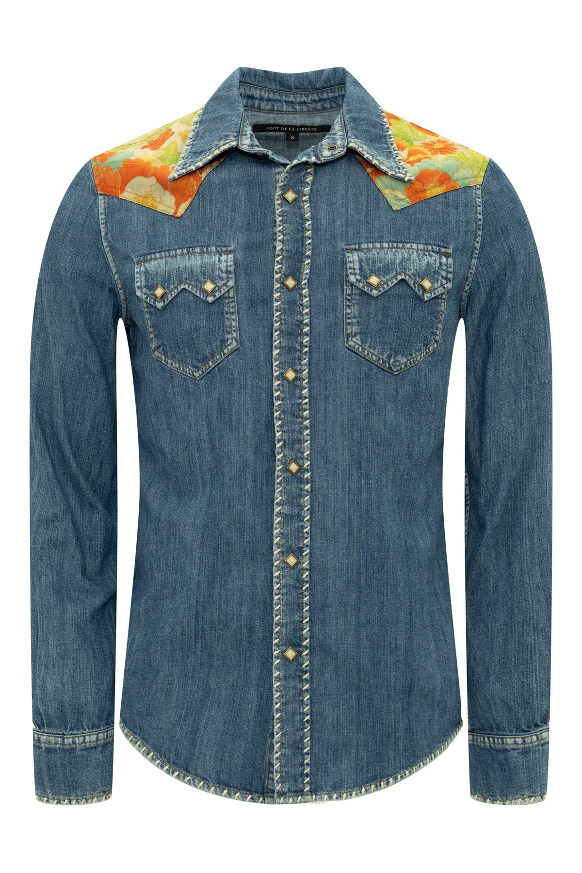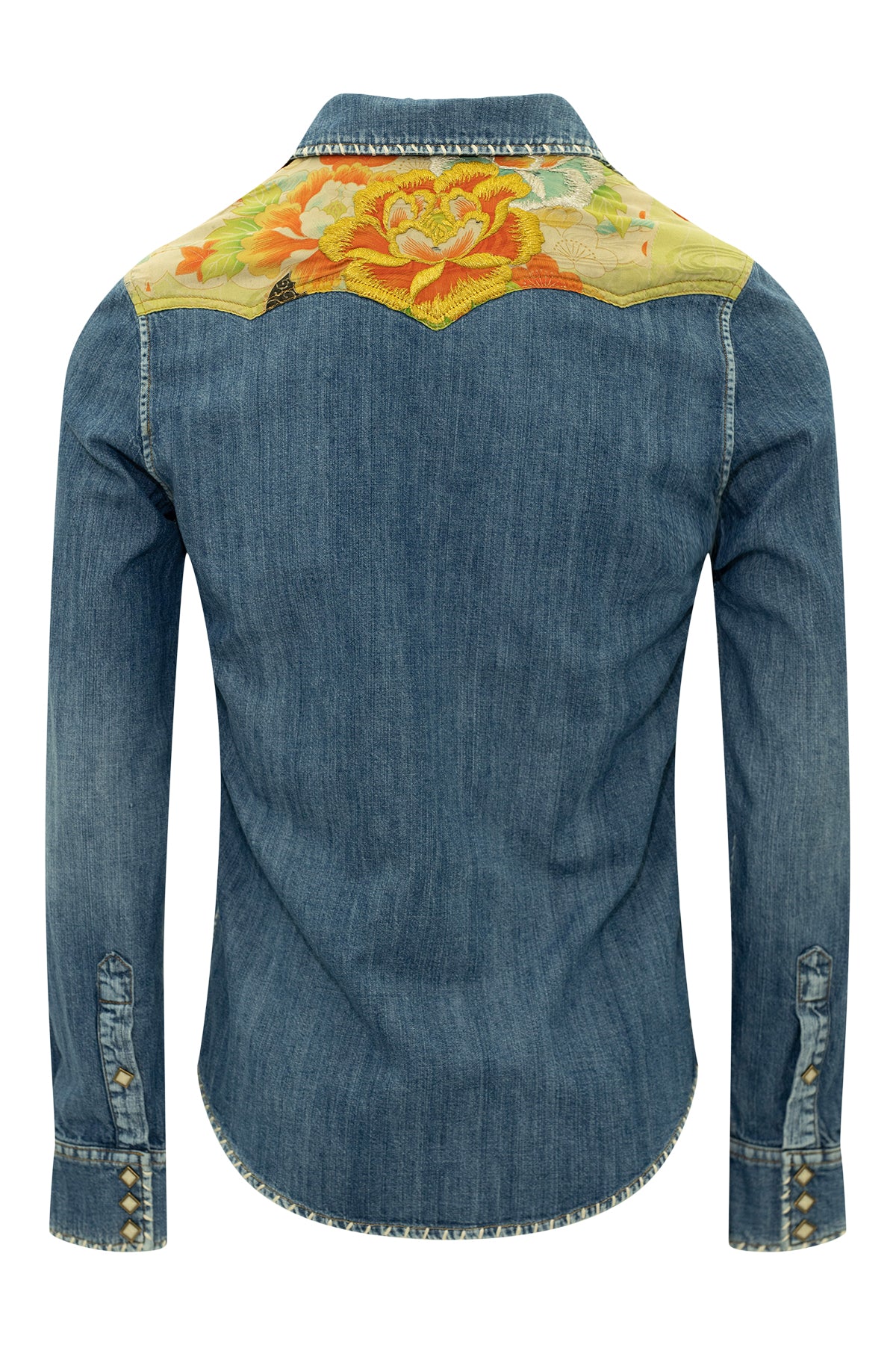 Western Shirt with snap button front closure and snap button flap pockets. Crafted from 100% cotton with silk vintage kimono contrast for a unique and standout design. Premium European fabric. Made in the USA.