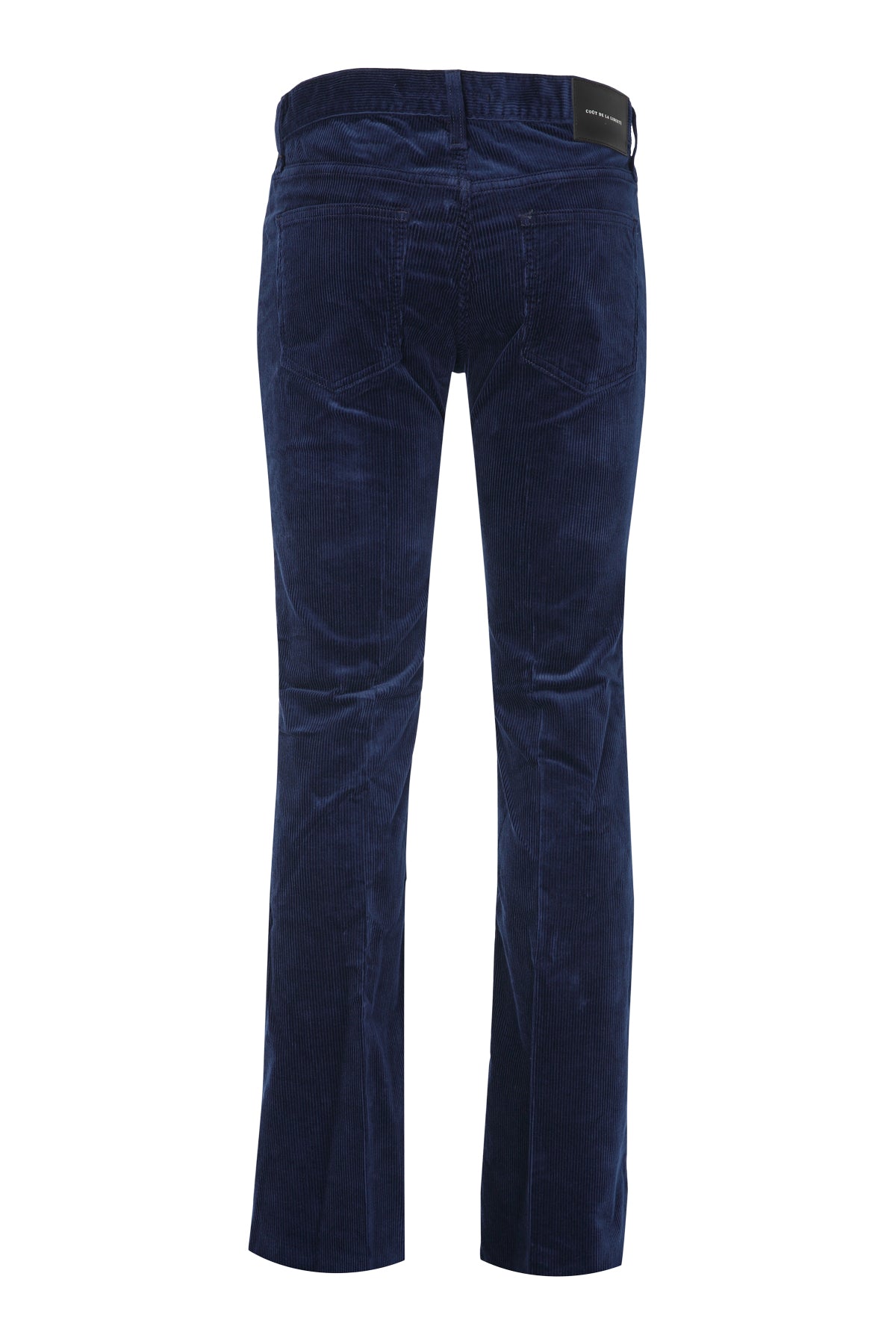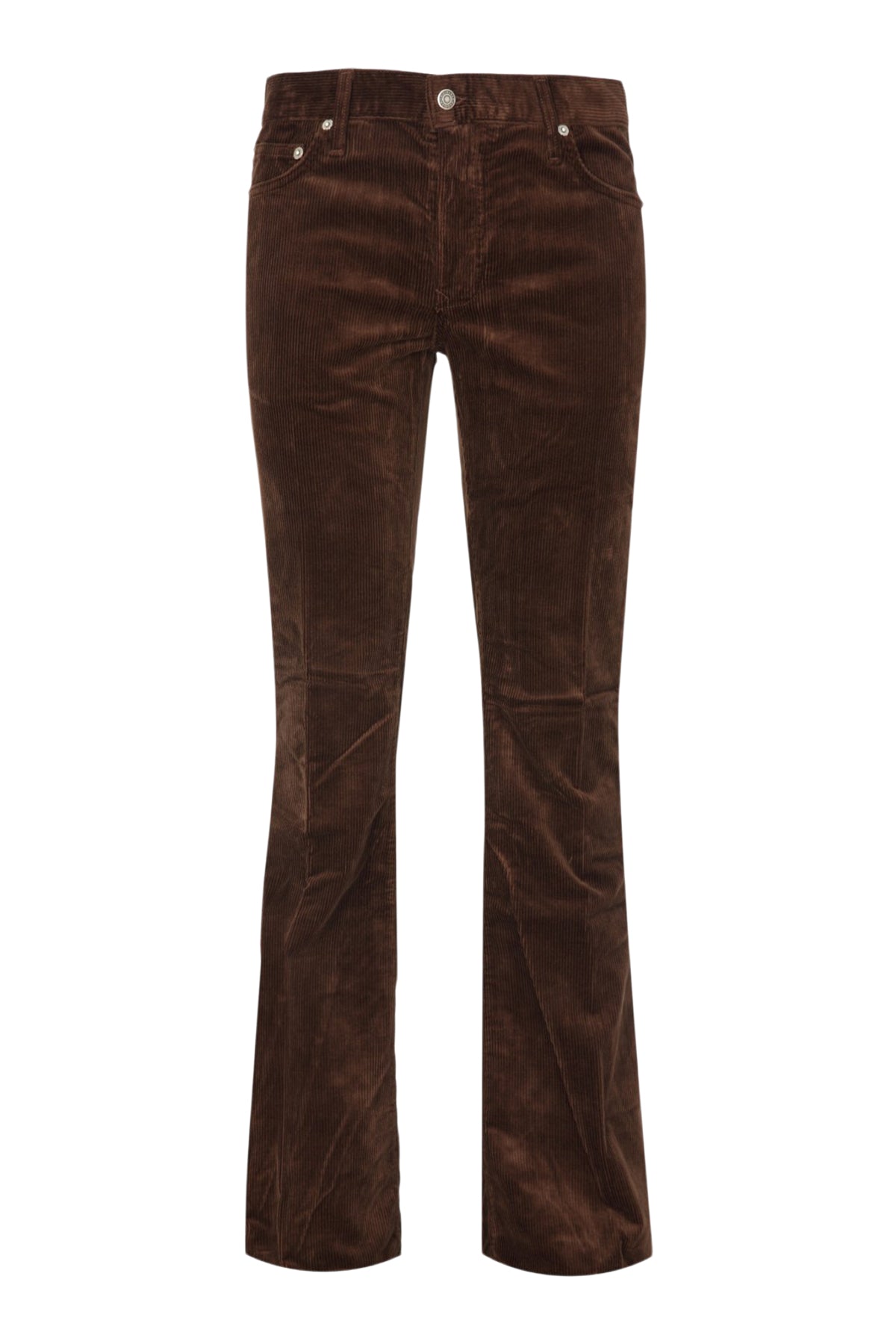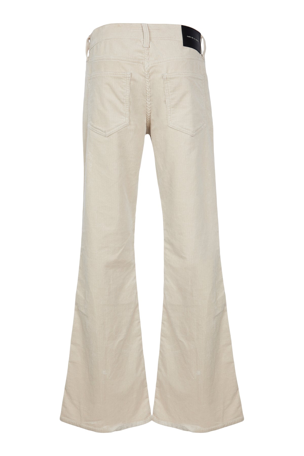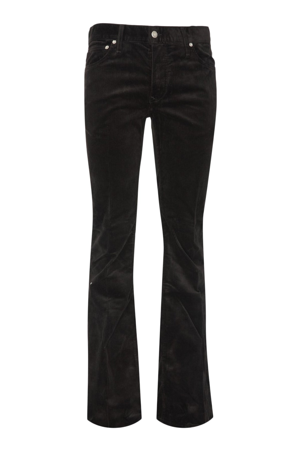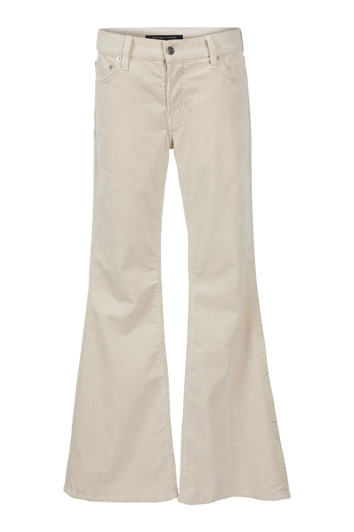Low-rise flare pants with button front closure and classic five-pocket styling. Crafted from 99% cotton and 1% elastane for a comfortable and flexible fit. Premium European fabric. Made in the USA.
