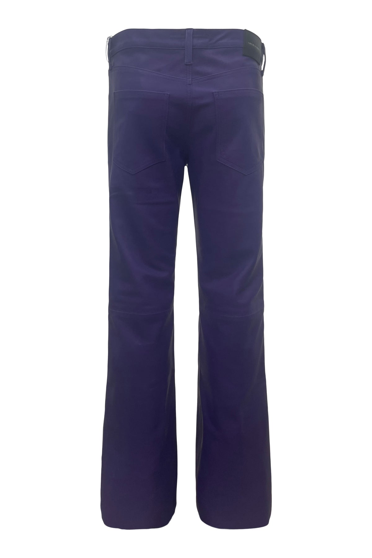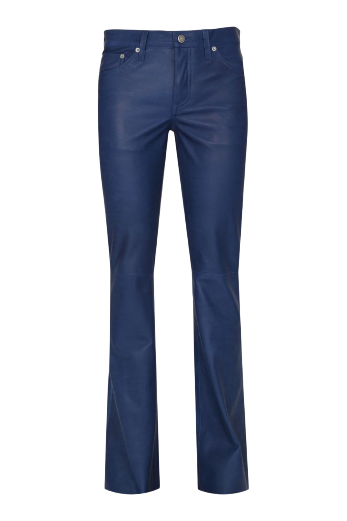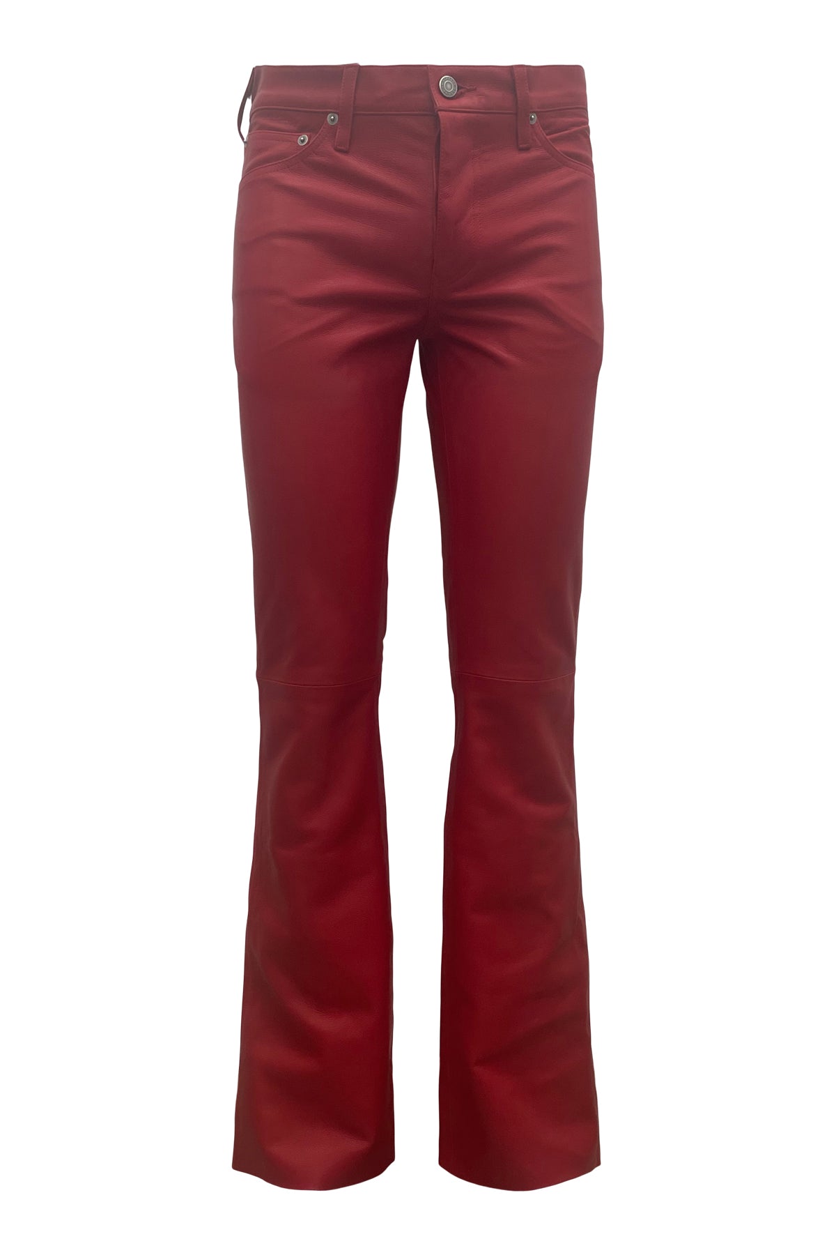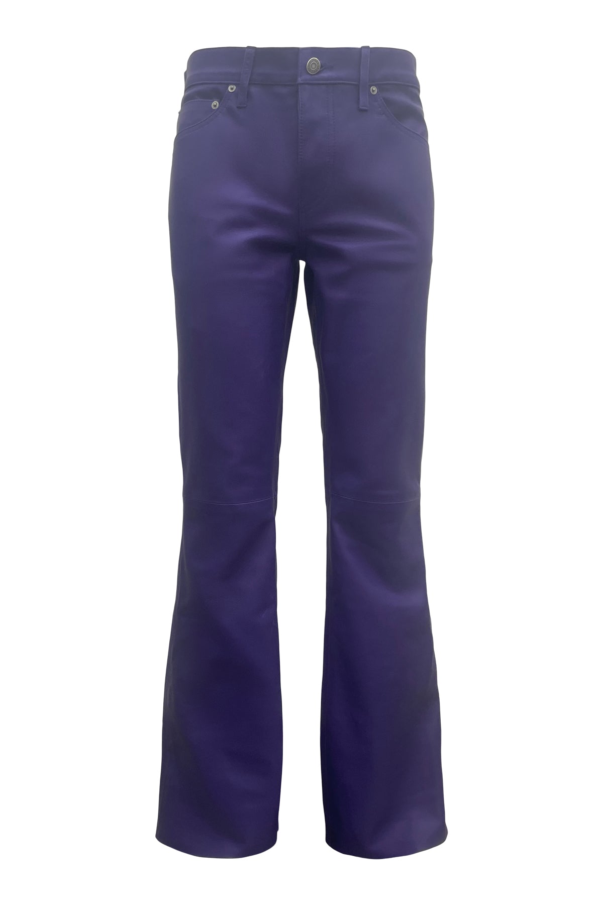 Low-rise flare pants with button front closure and classic five-pocket styling. Crafted from 100% calfskin for a luxurious finish. Premium European fabric. Made in the USA.