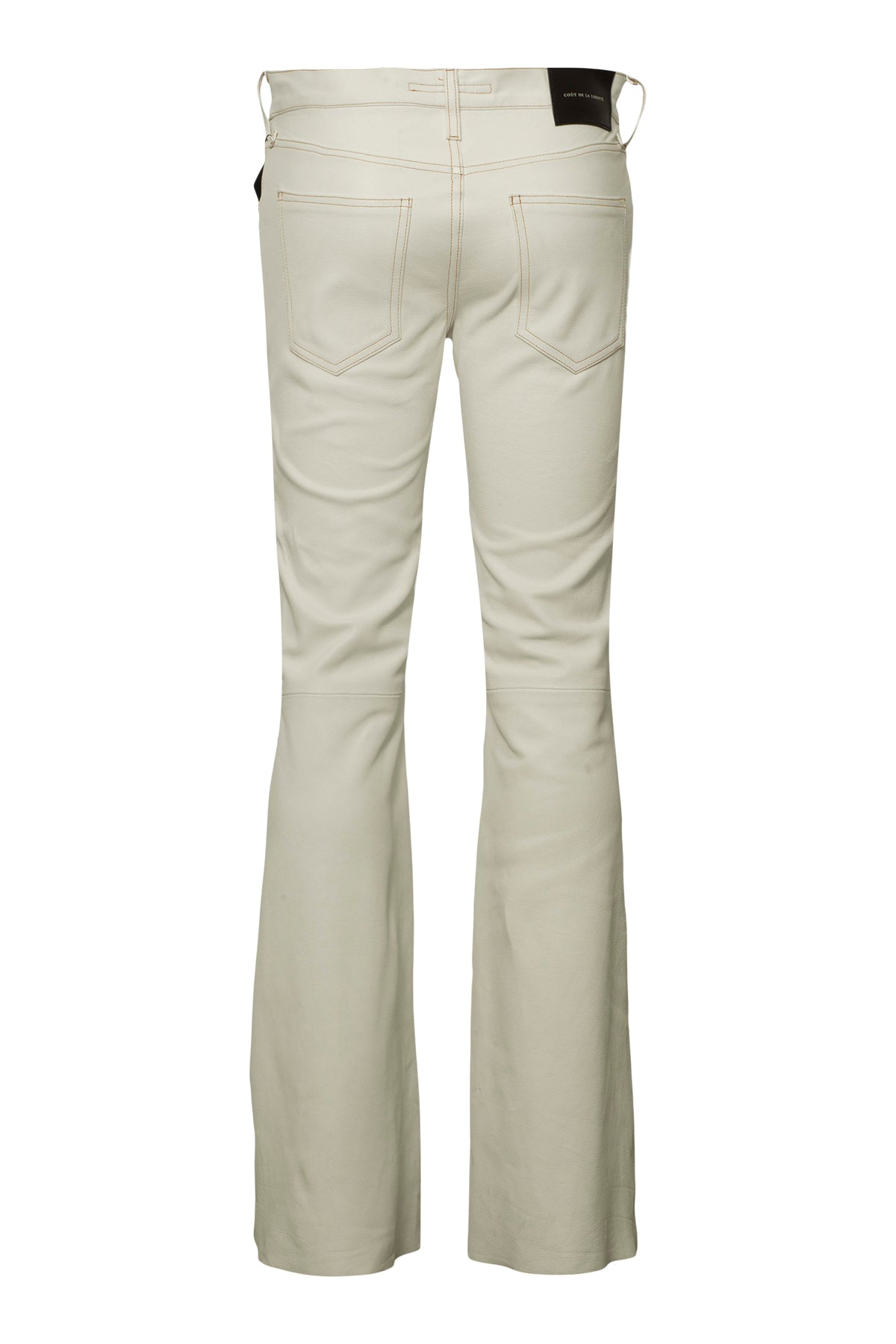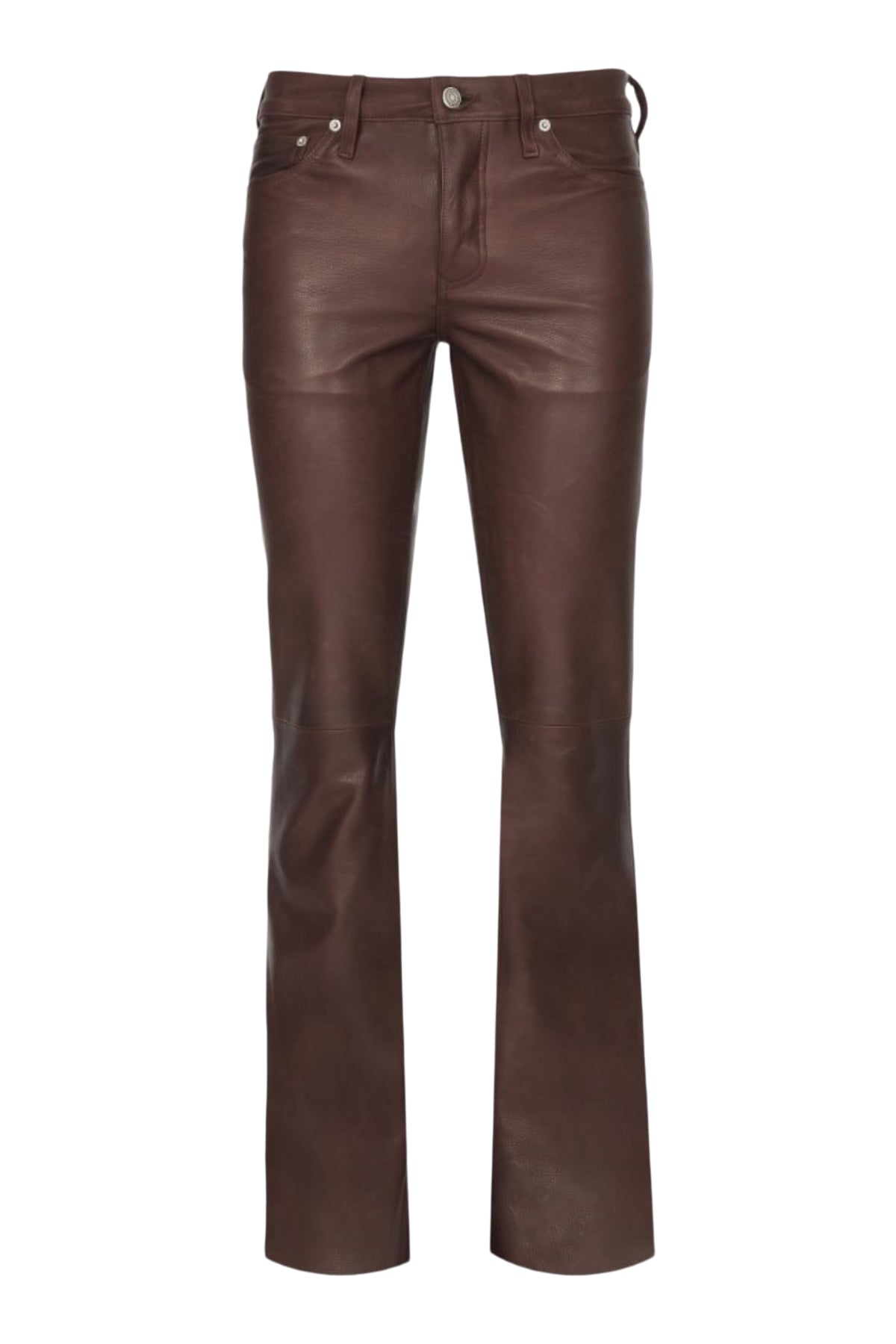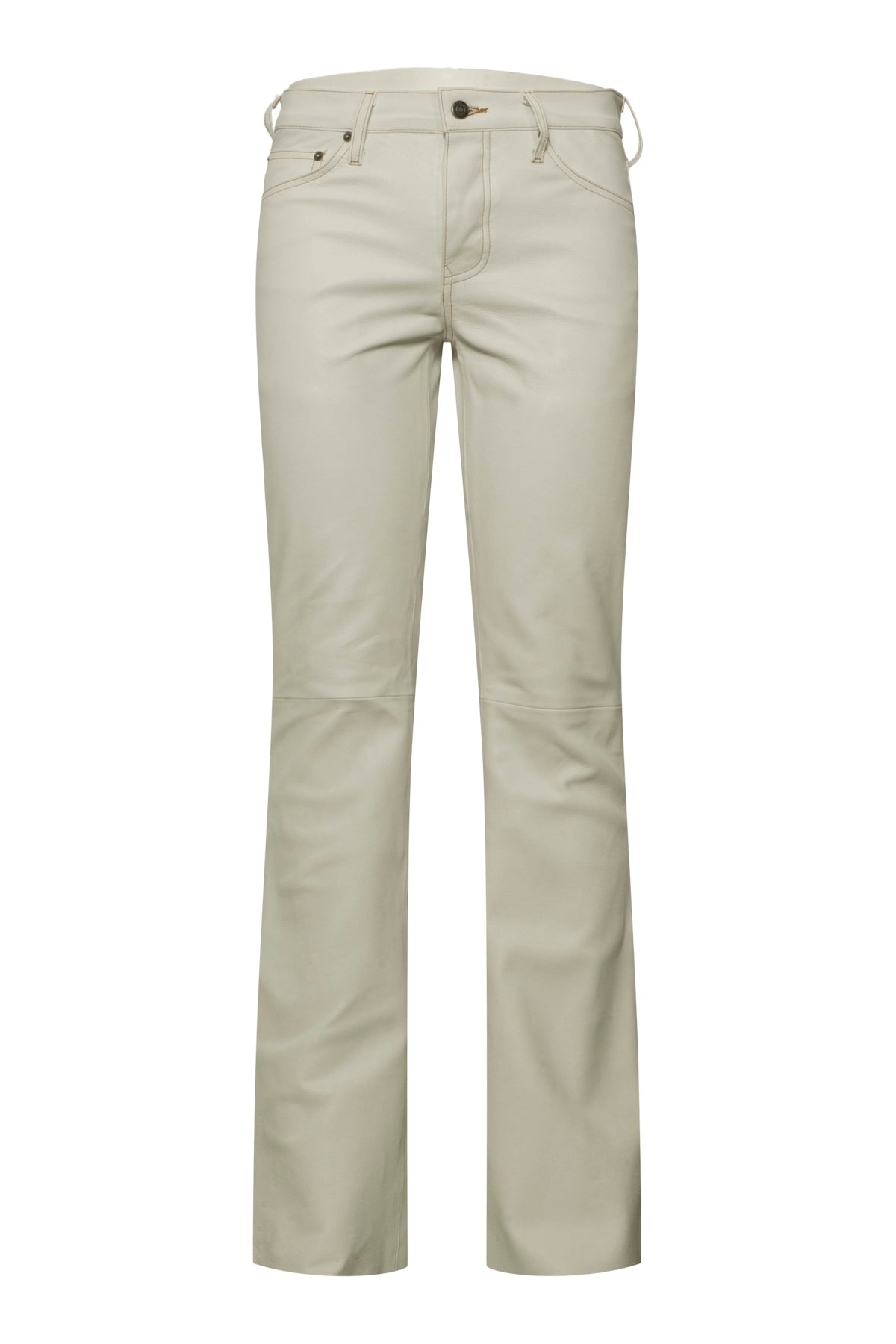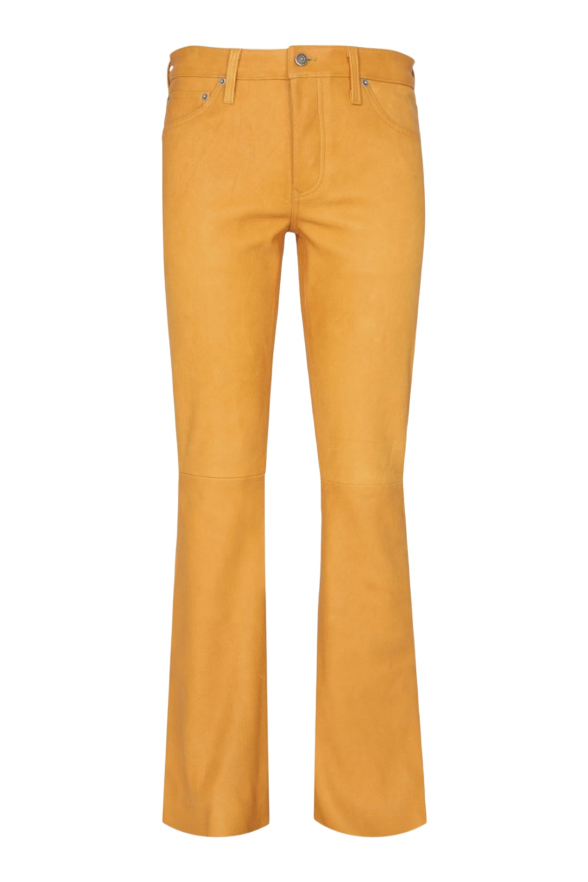 Low-rise flare pants with button front closure and classic five-pocket styling. Crafted from 100% calfskin for a luxurious finish. Premium European fabric. Made in the USA.