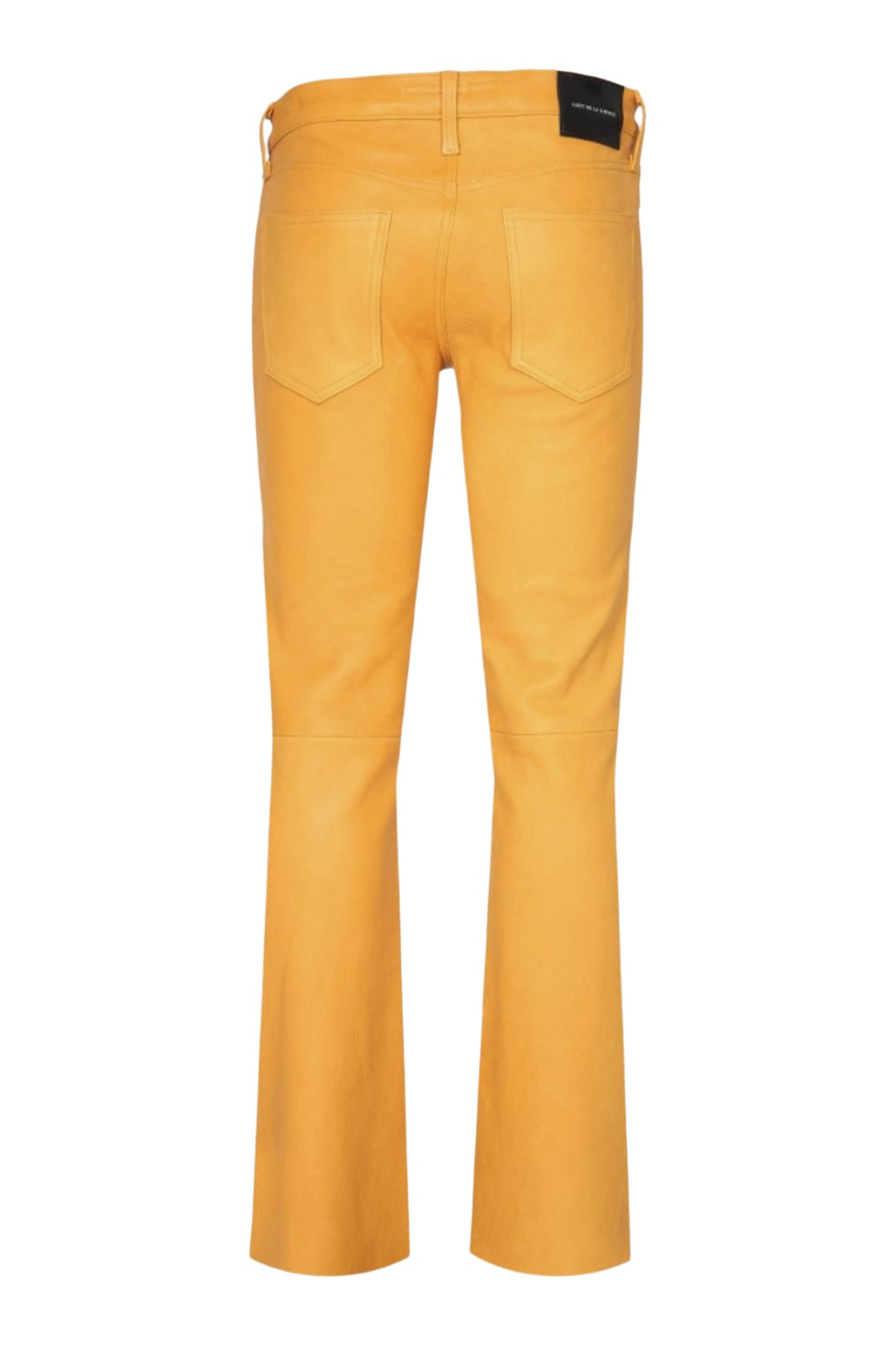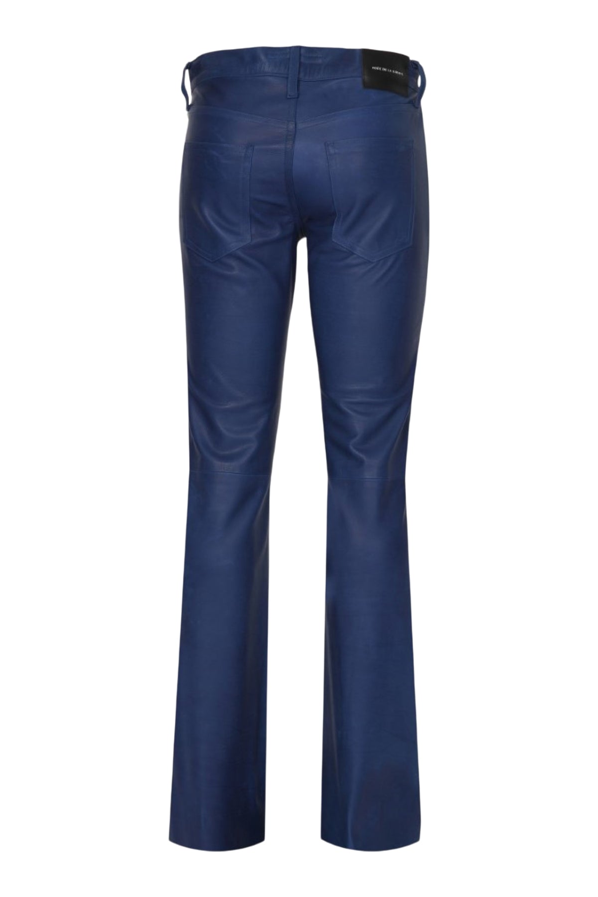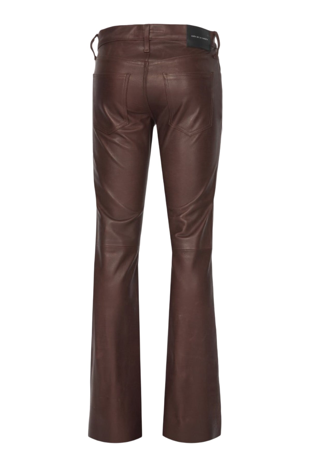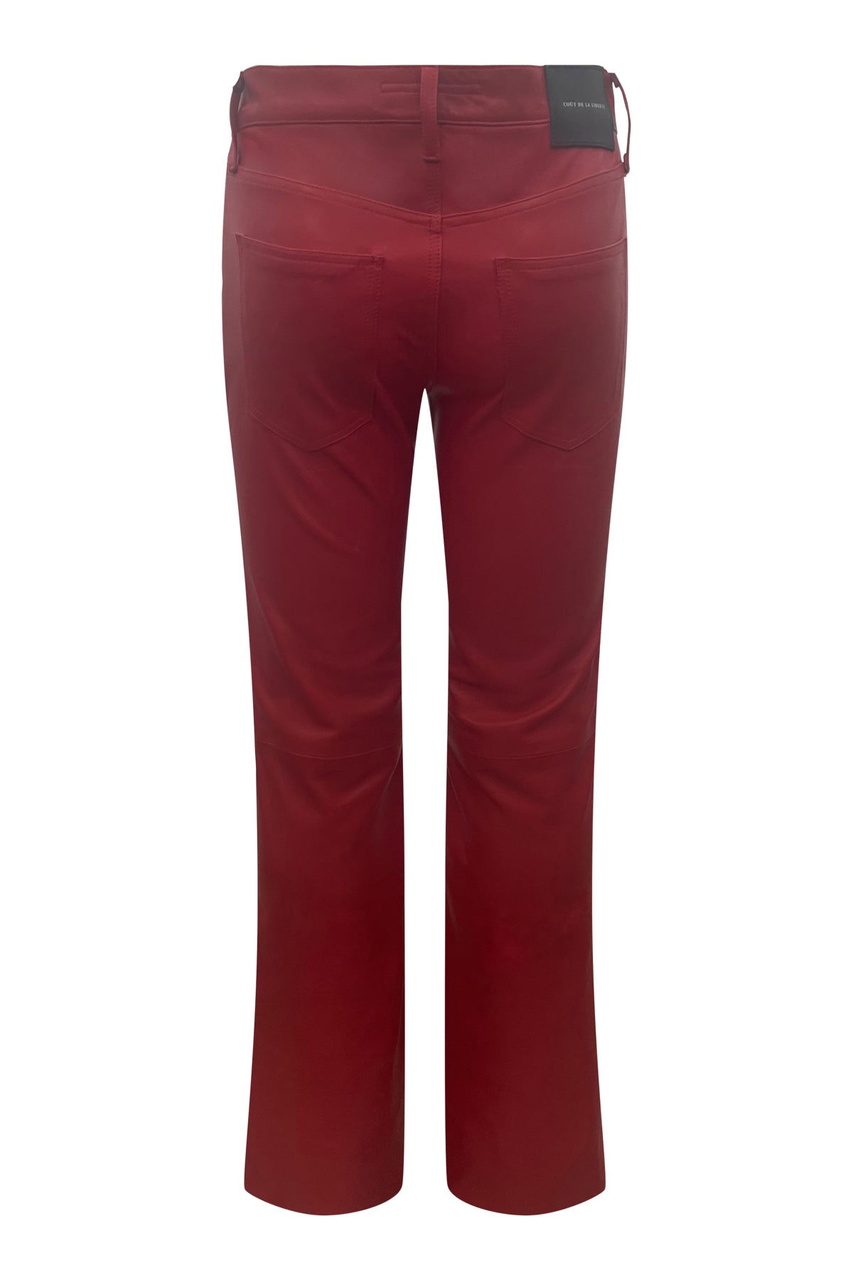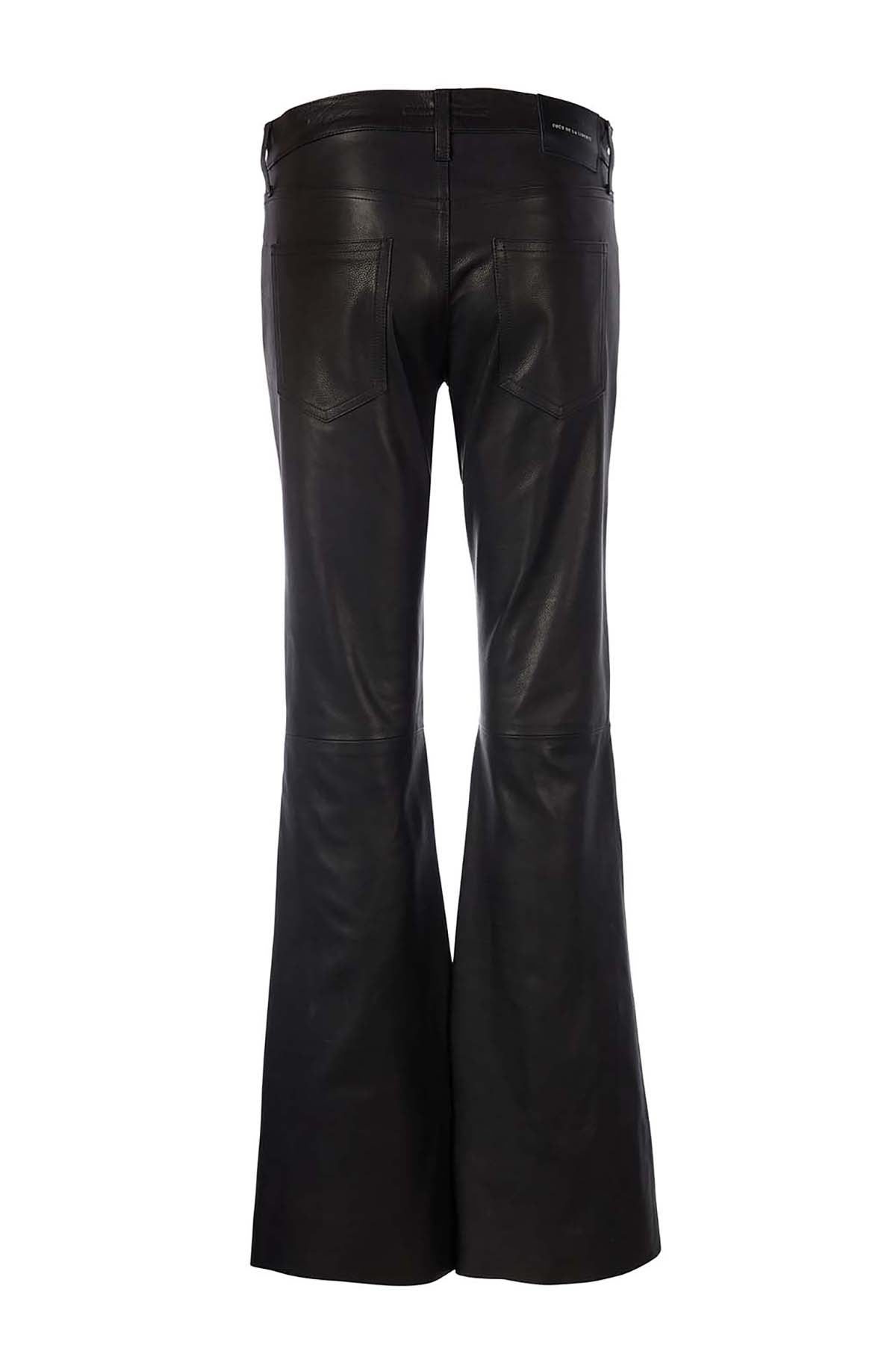 Low-rise flare pants with button front closure and classic five-pocket styling. Crafted from 100% calfskin for a luxurious finish. Premium European fabric. Made in the USA.
