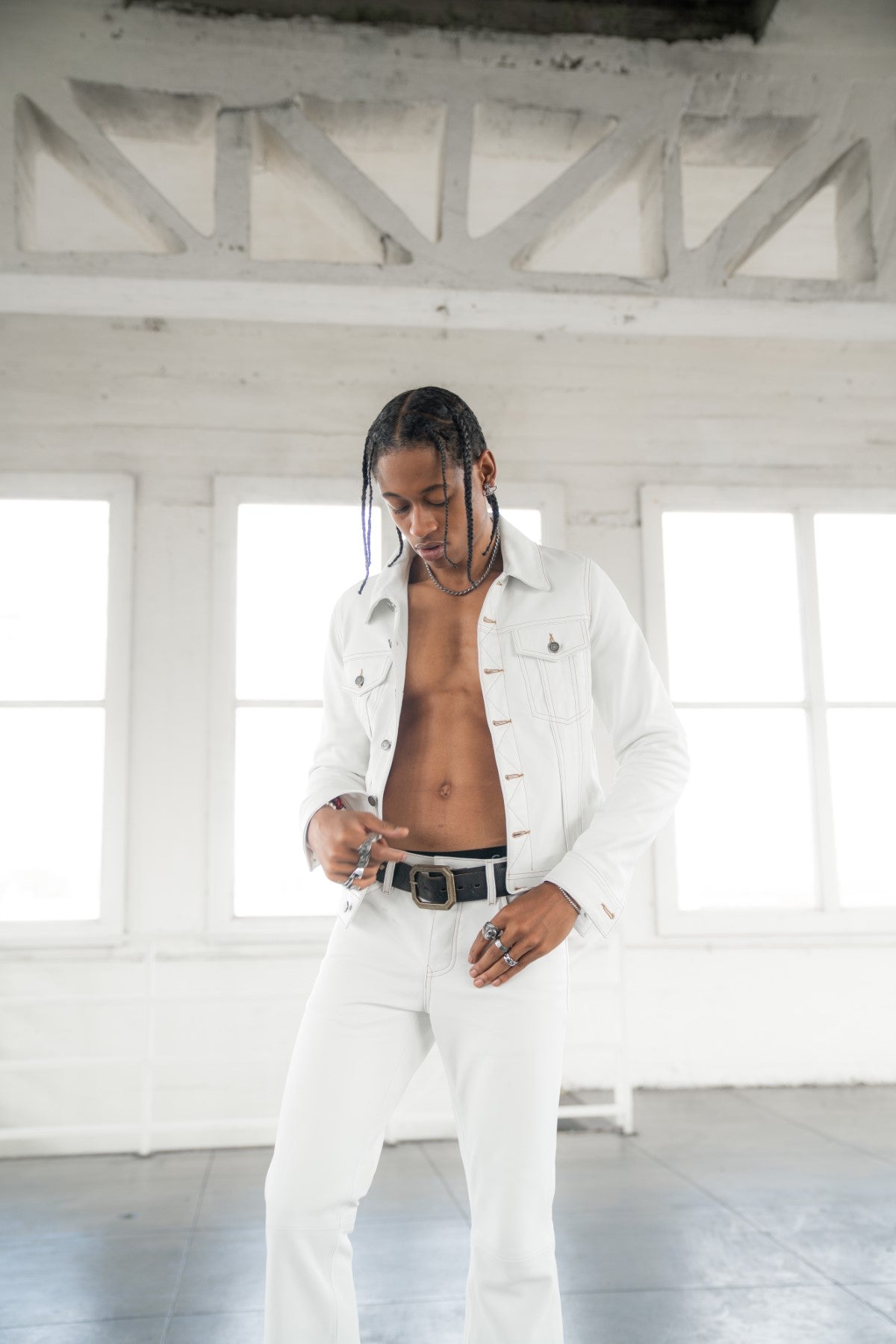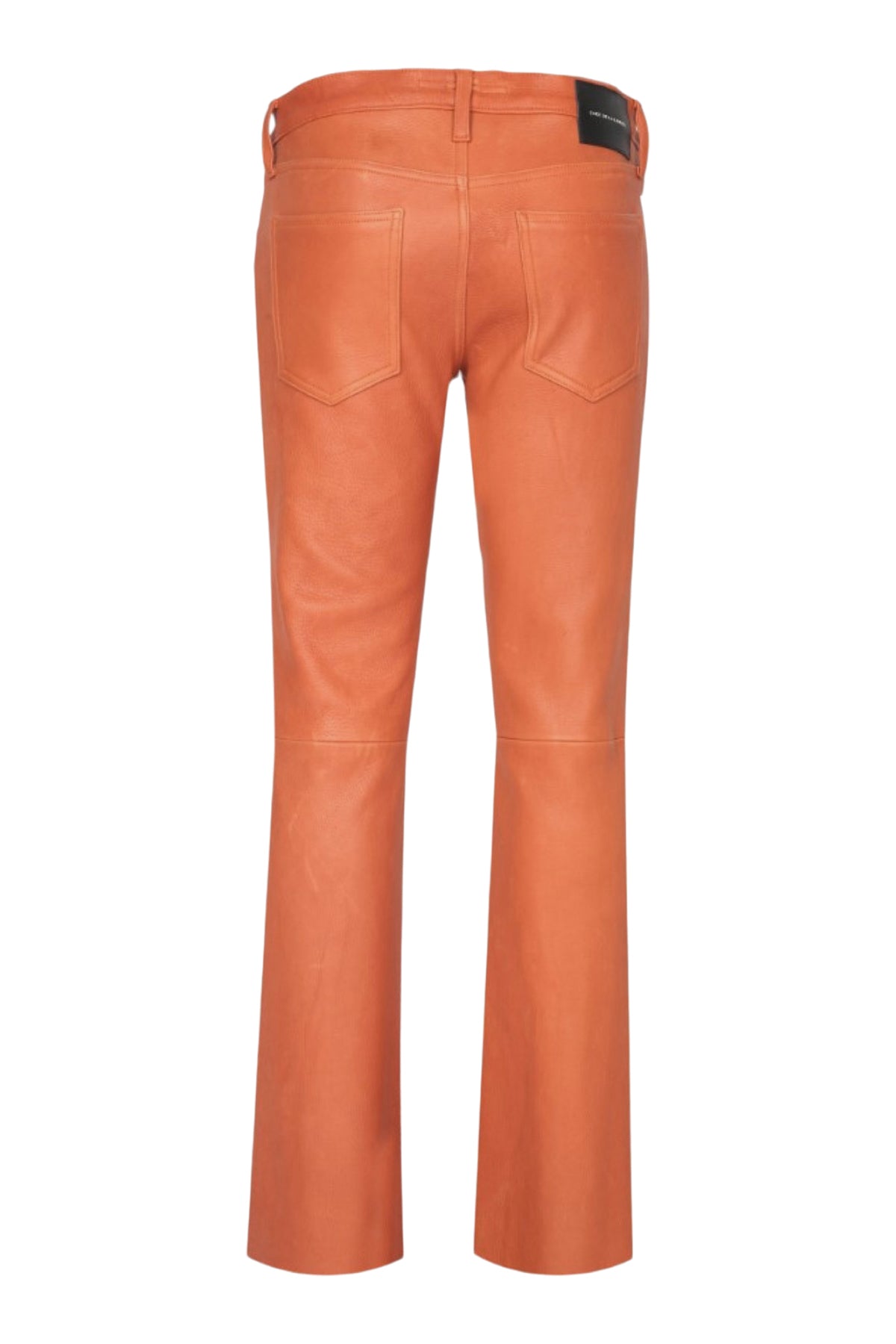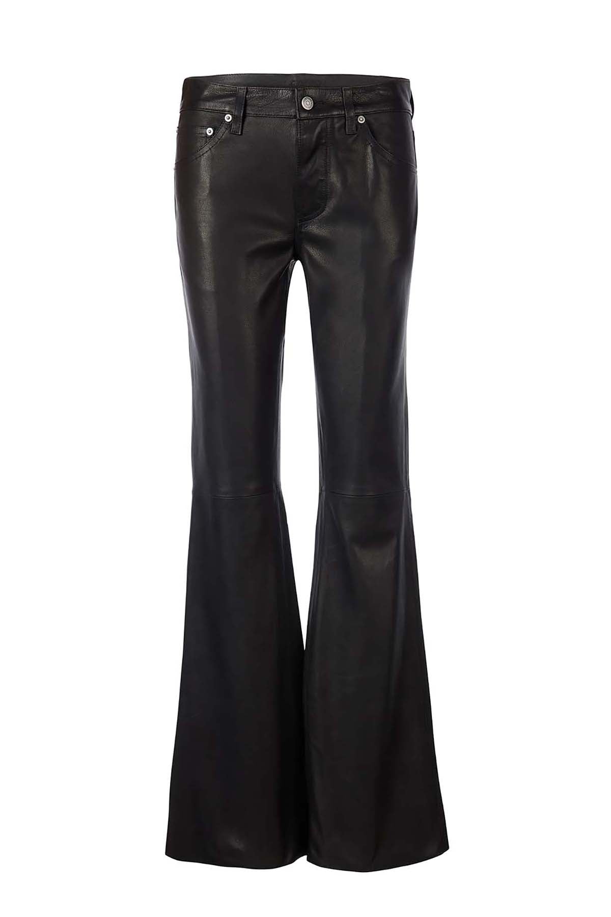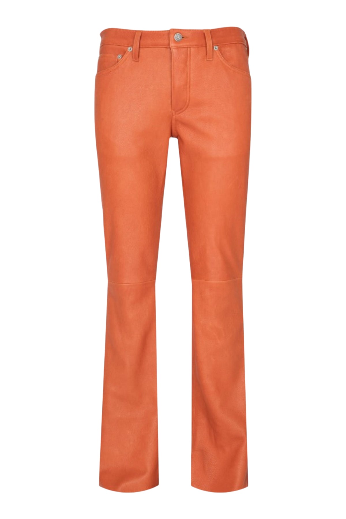 Low-rise flare pants with button front closure and classic five-pocket styling. Crafted from 100% calfskin for a luxurious finish. Premium European fabric. Made in the USA.