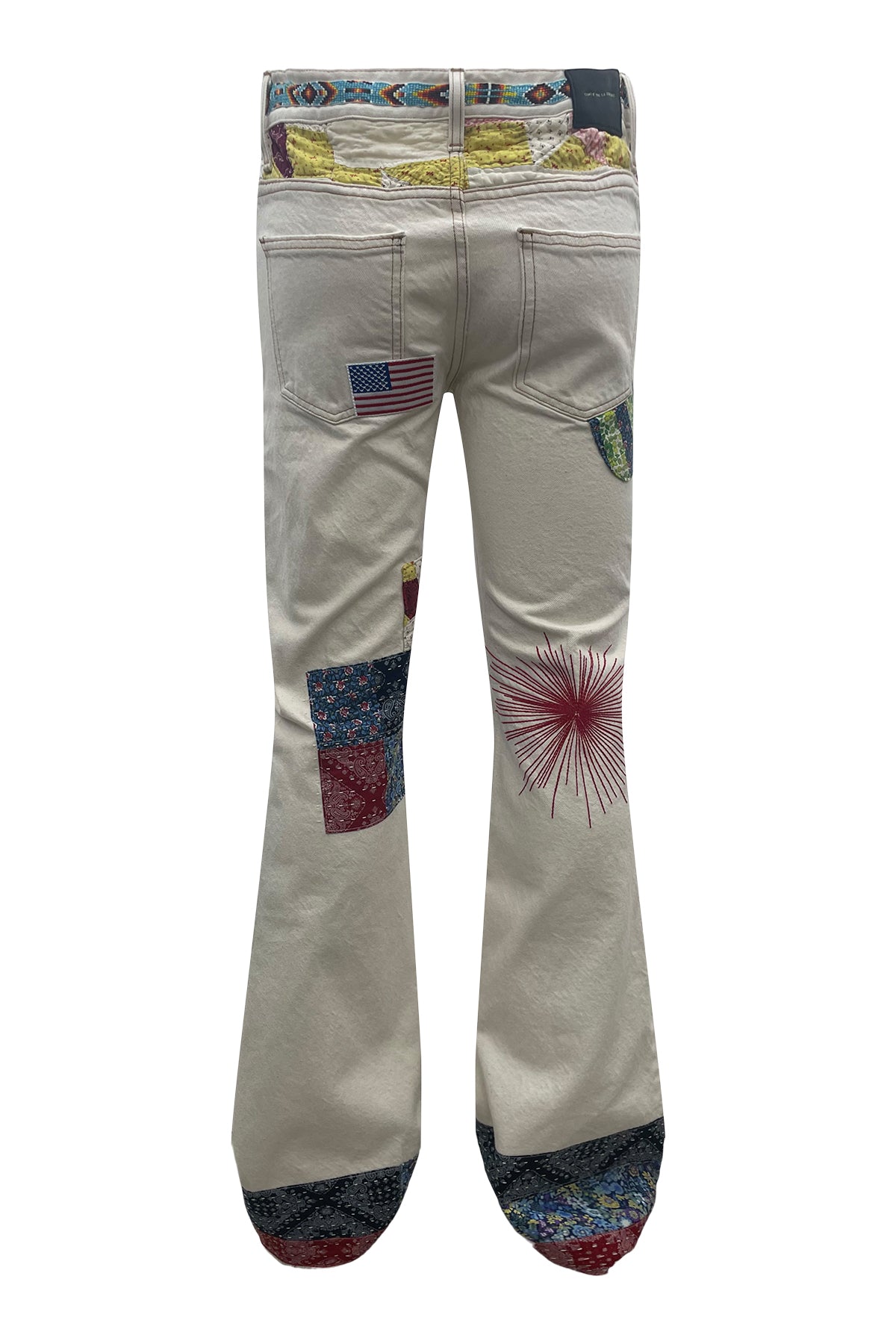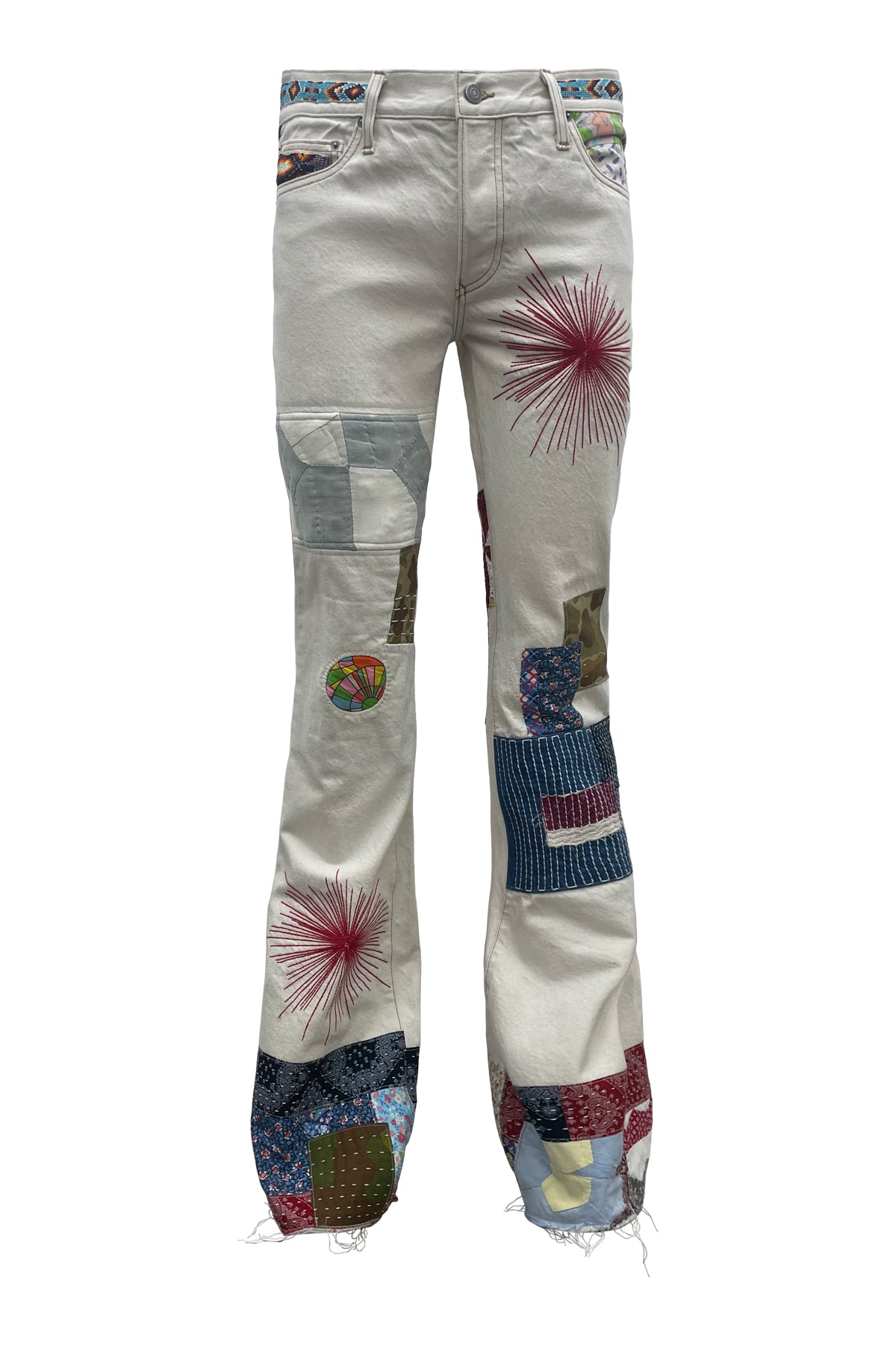 Patchwork Embroidered Low-Rise Flare pants with button front closure and classic five-pocket styling. Crafted from 100% cotton with intricate beading embellishments for a unique and standout design. Premium European fabric. Made in the USA.