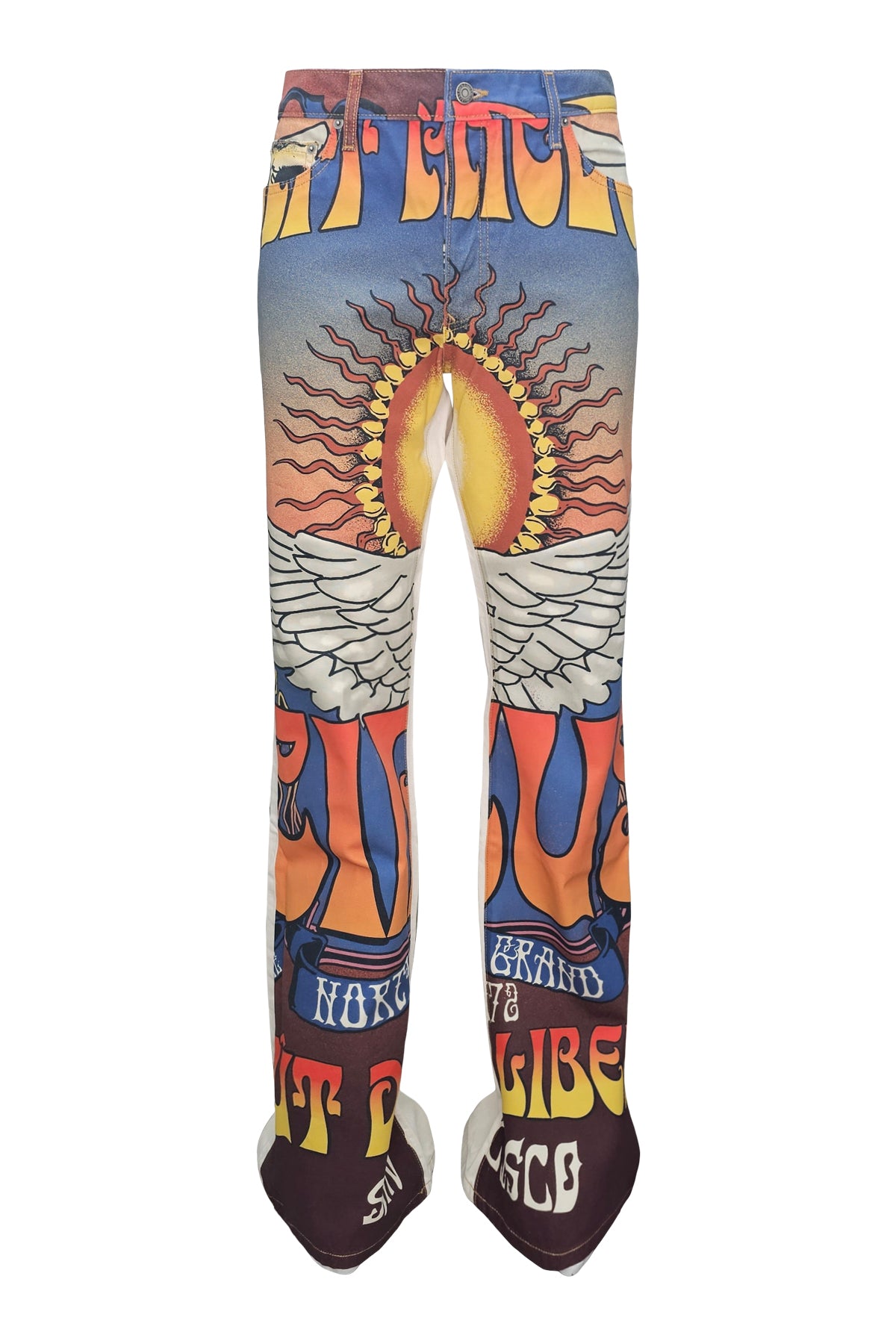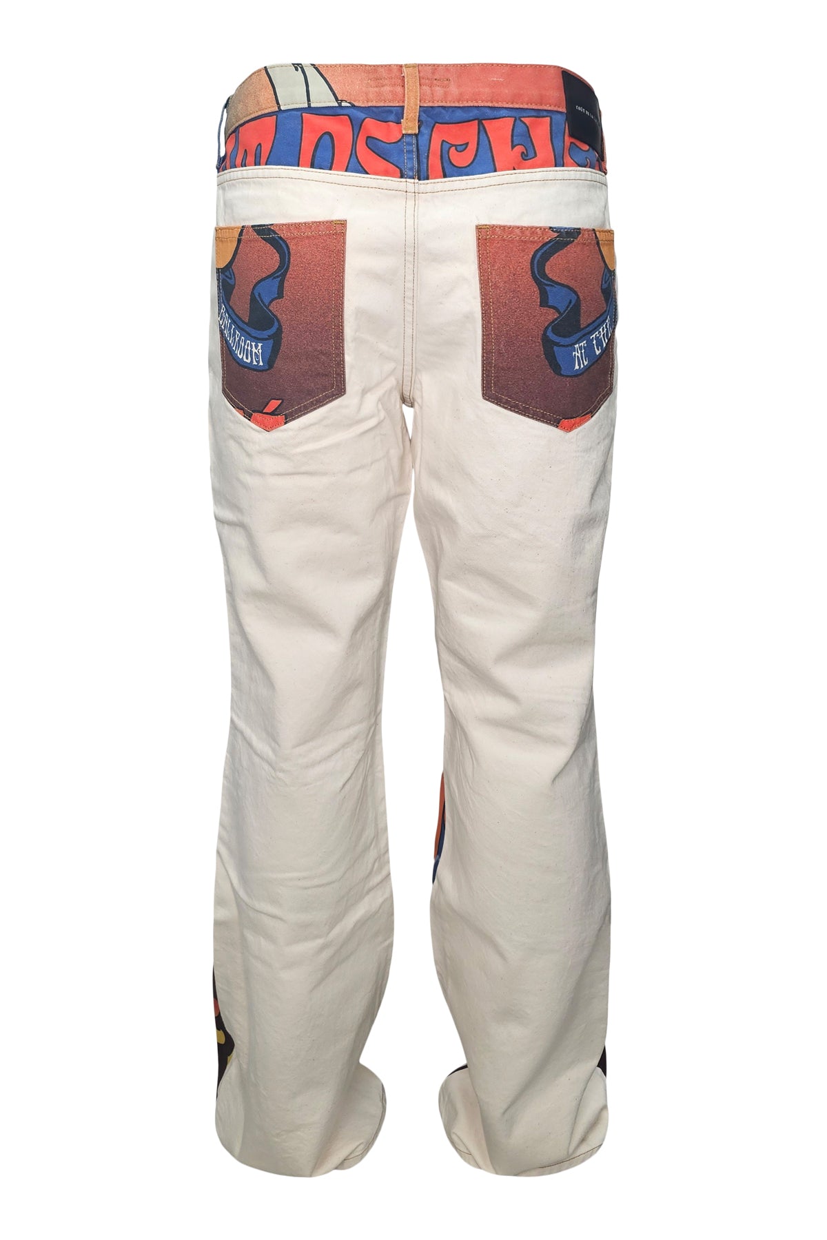 Low-rise flare jeans with button front closure. Crafted from 100% cotton with classic five-pocket styling and a distinctive printed design. Premium European fabric. Made in the USA.