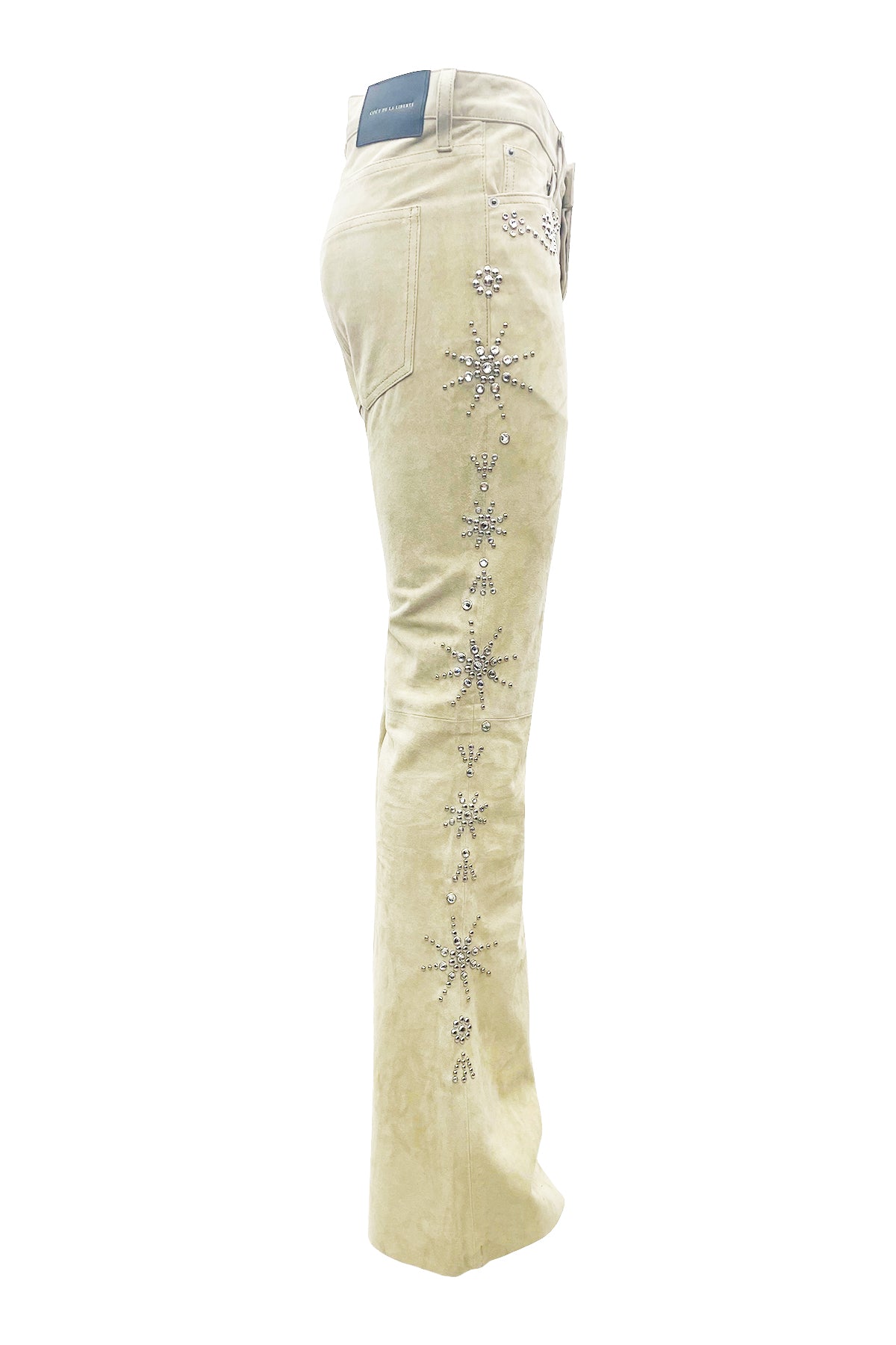 Leather flare pants with button and zip front closure. Crafted from 100% lambskin with embellished suede detailing. Features studded hardware accents and classic five-pocket styling. Premium European fabric. Made in the USA.