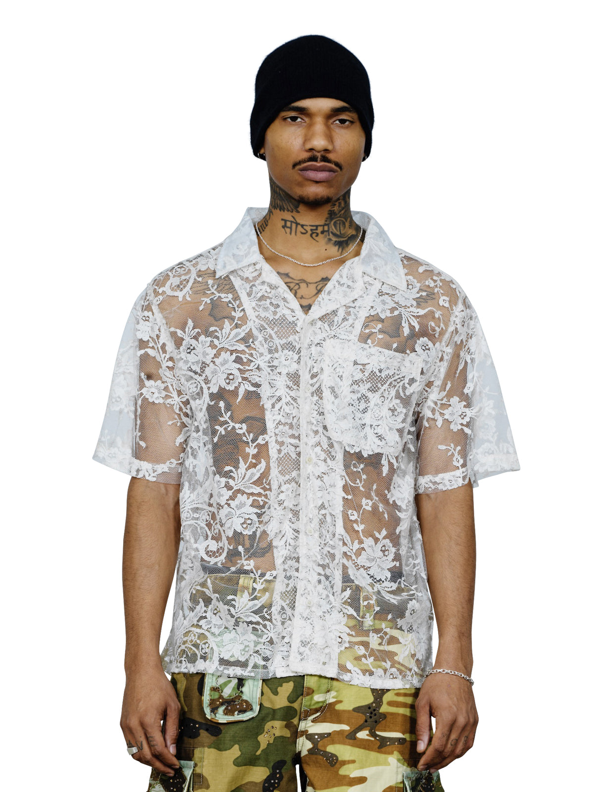 Robbie Floral Lace Bowling Shirt, crafted from a luxurious blend of 72% cotton and 28% polyamide for a soft yet structured feel. Designed with intricate floral lace detailing for a refined, modern twist on a classic silhouette. Made in the USA.