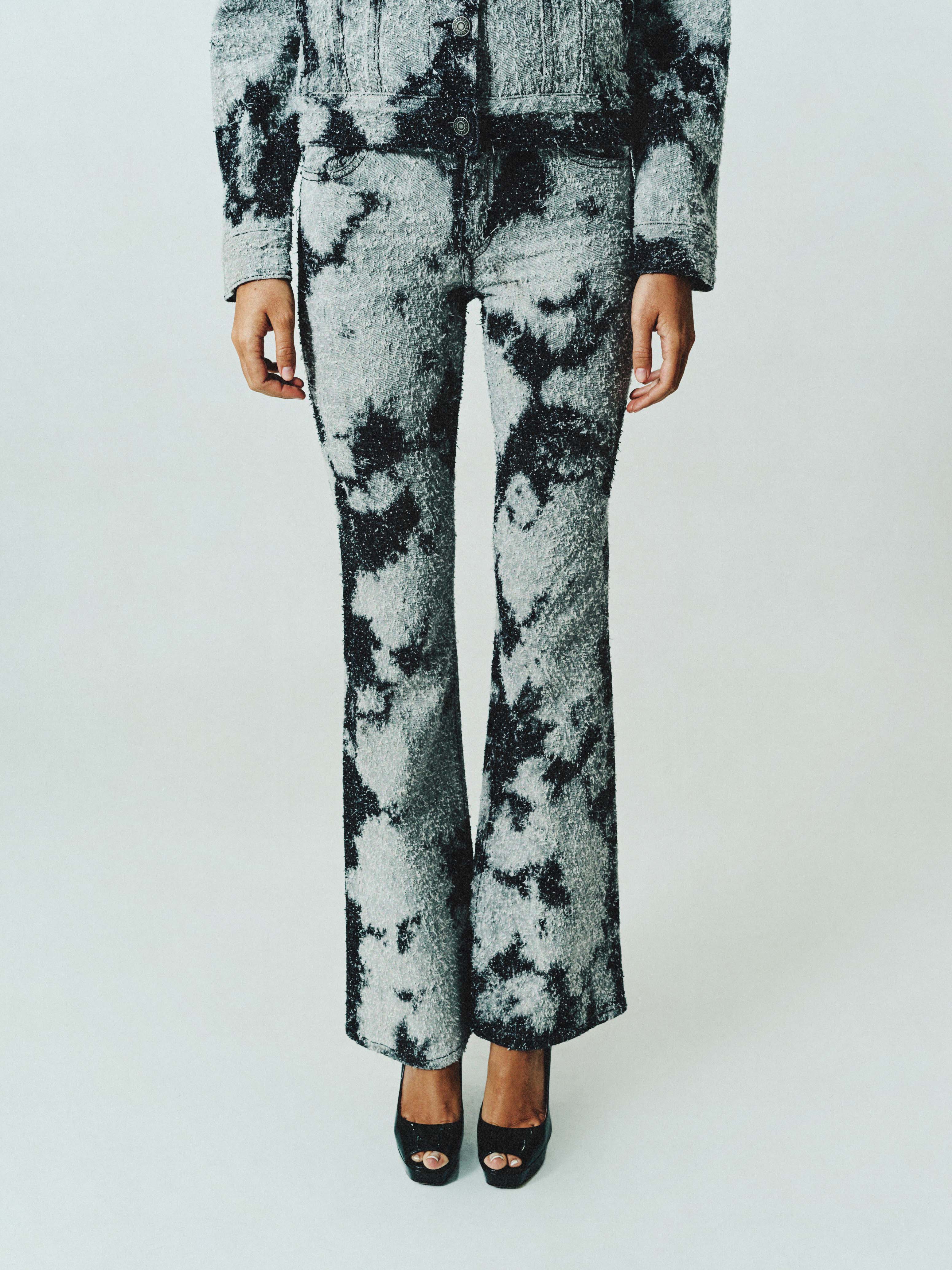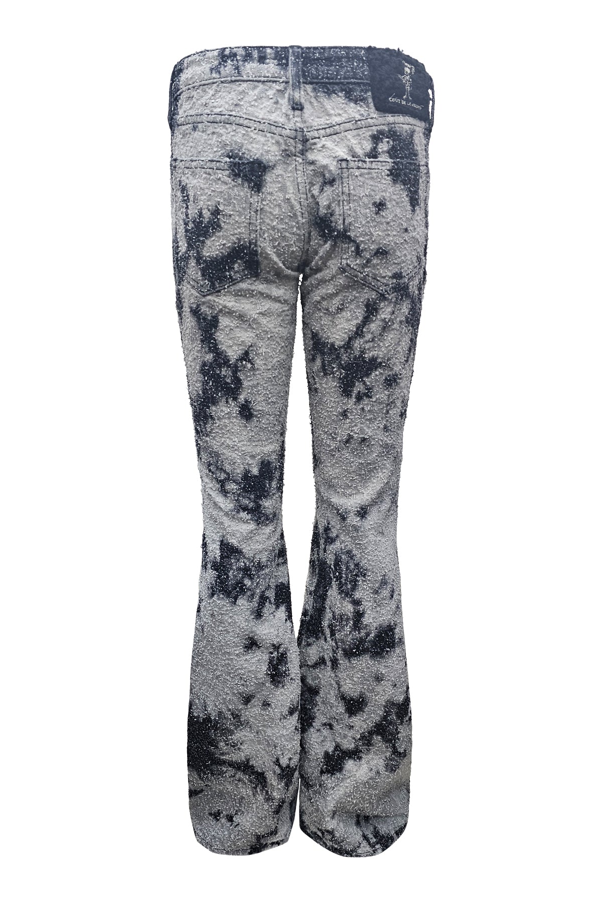Mid-rise denim flare jeans with button and zip front closure. Features a distinctive looped denim effect for bold style. Crafted from 100% cotton with five-pocket styling. Premium European fabric. Made in the USA.
