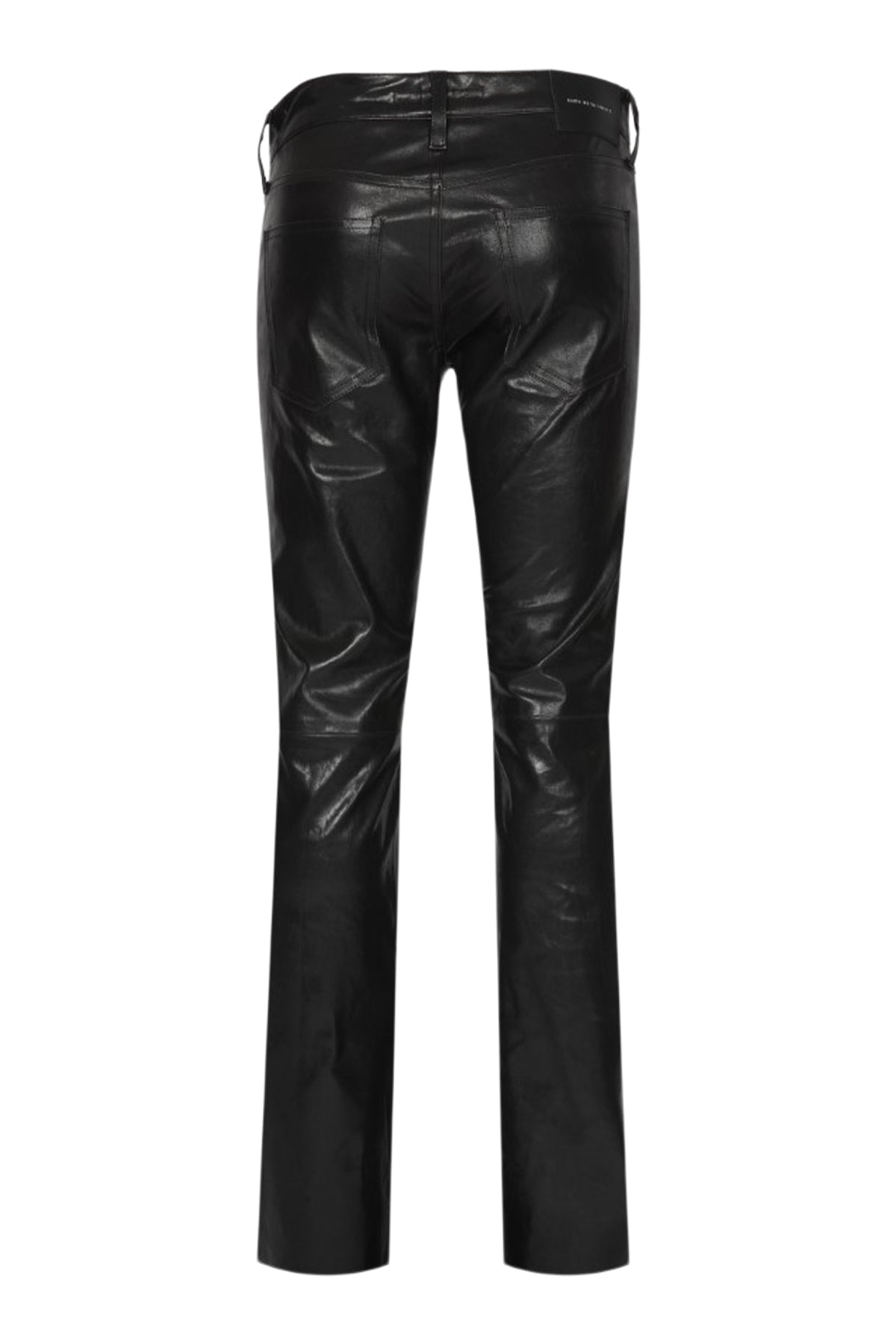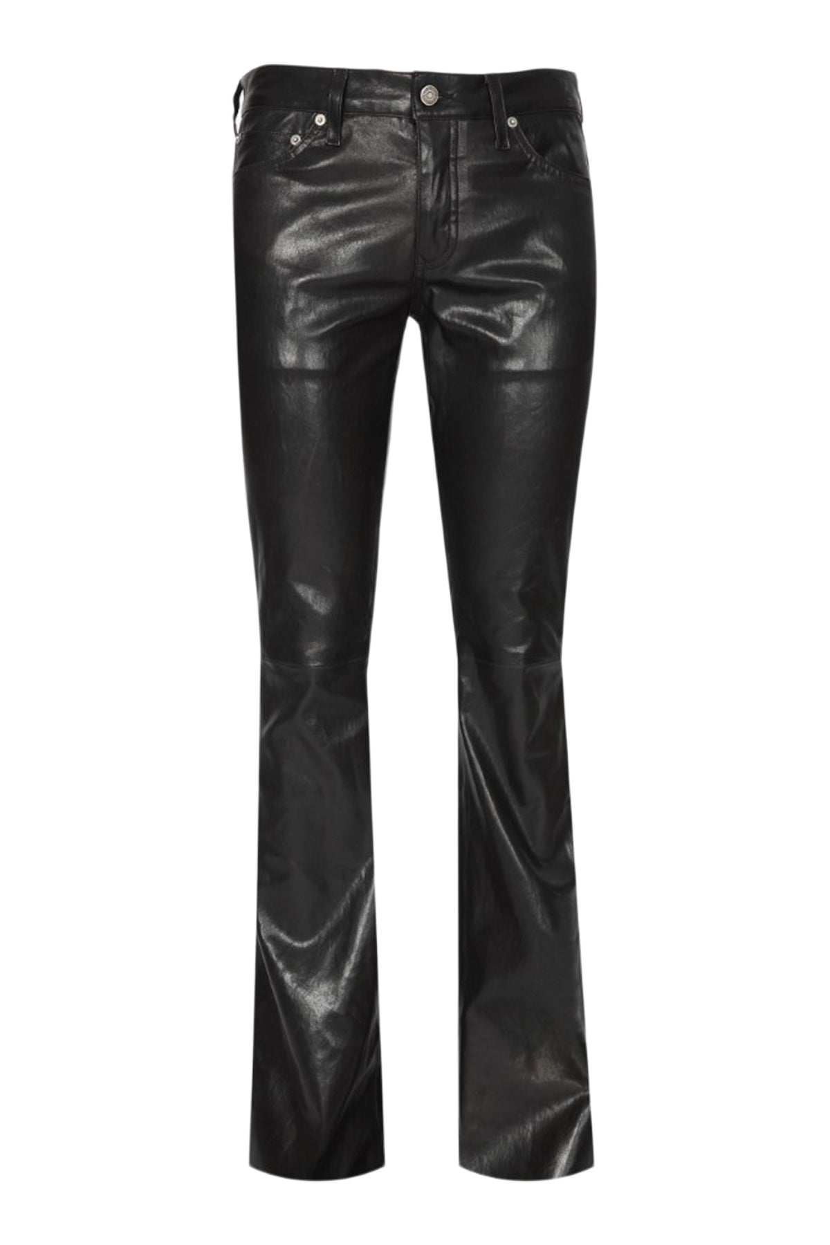 Low-rise flare pants with button front closure and classic five-pocket styling. Crafted from 100% stretch lambskin for a luxurious and flexible fit. Premium European fabric. Made in the USA.