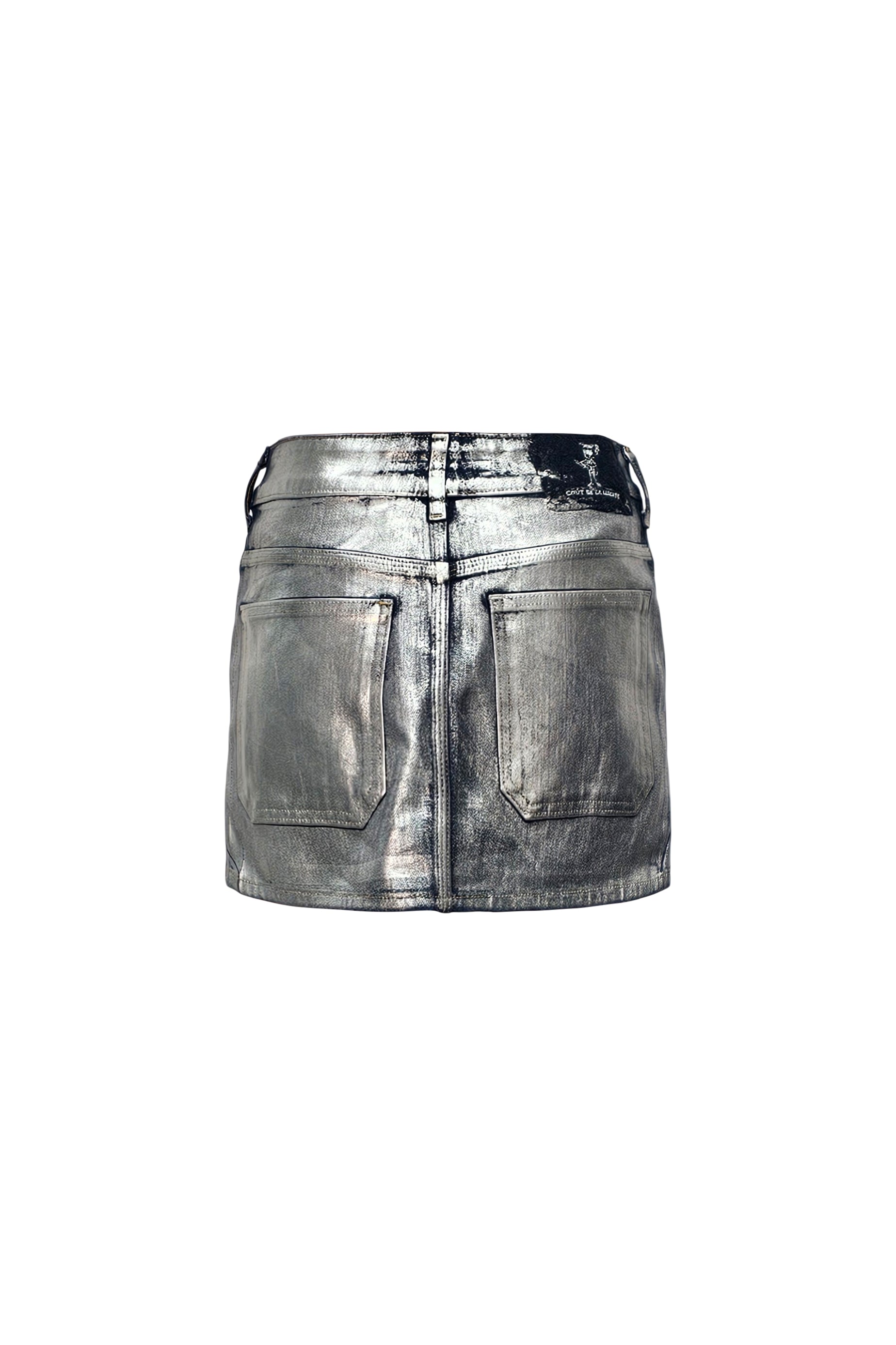 Penelope Denim Mini Skirt with a silvered foil denim finish for a subtle, shimmering glow. Features a button and zip front closure for a flawless fit and classic five-pocket styling. Crafted from a blend of 98% cotton and 2% elastane for comfort and flexibility. Premium European fabric. Made in the USA.