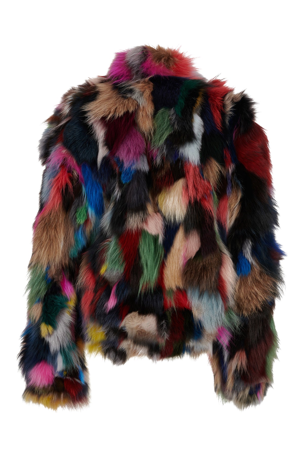 Fur biker jacket with zip front closure. Features a shell crafted from 100% fox fur in multicolored hues, contrasted with 100% calfskin for a sleek finish. Lined with 100% viscose for smooth, comfortable wear. Premium European fabric. Made in the USA.