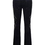 Leather flare pants with button and zip front closure. Crafted from 100% lambskin with embellished suede detailing. Features studded hardware accents and classic five-pocket styling. Premium European fabric. Made in the USA.