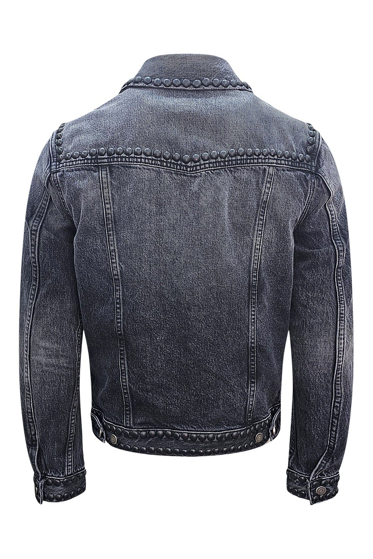 Embellished denim trucker jacket with button front closure. Crafted from 100% cotton featuring studded accents for a bold, edgy twist on a classic design. Includes button flap pockets for timeless functionality. Premium European fabric. Made in the USA.
