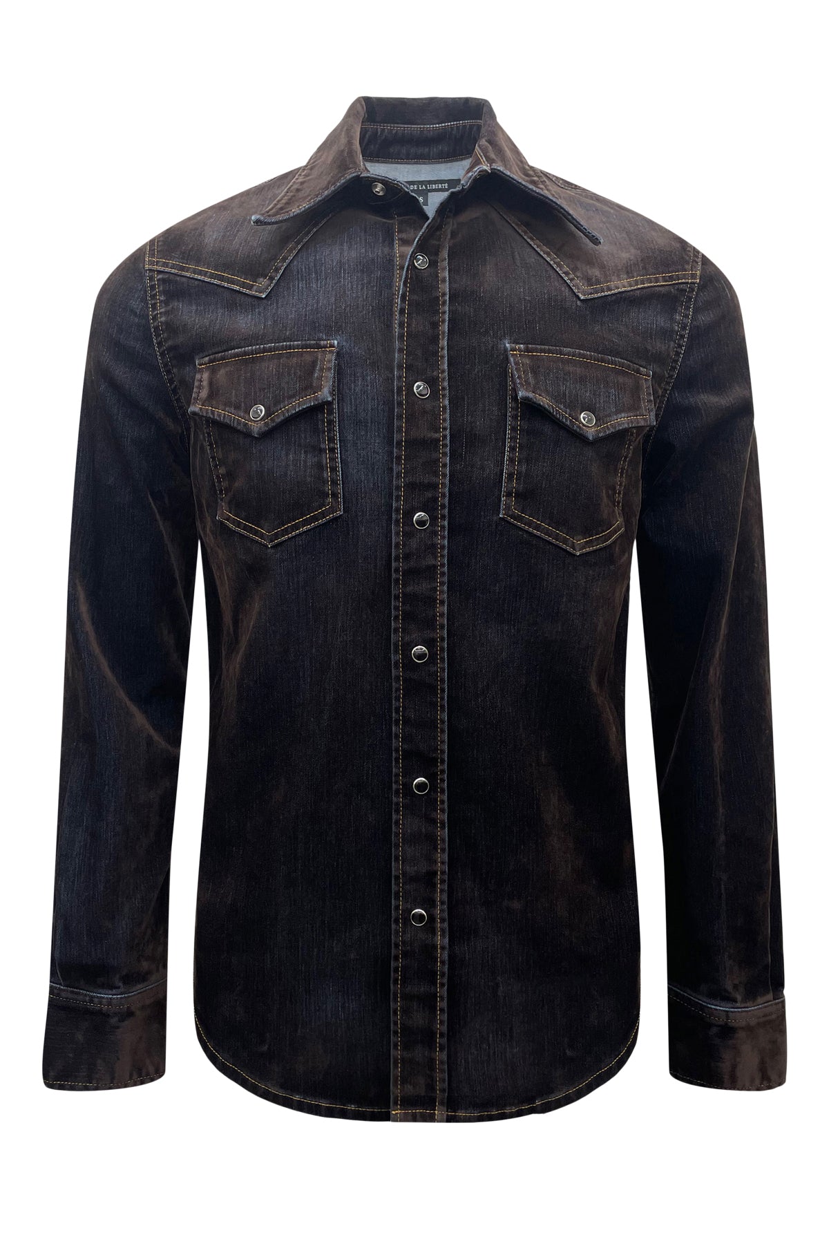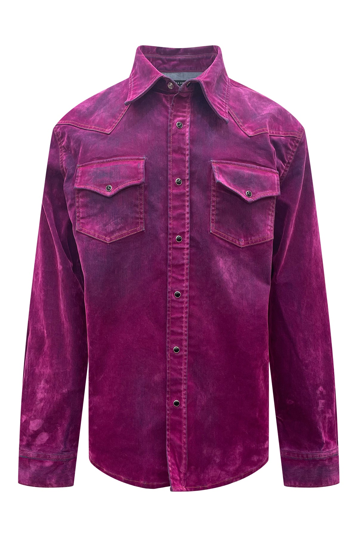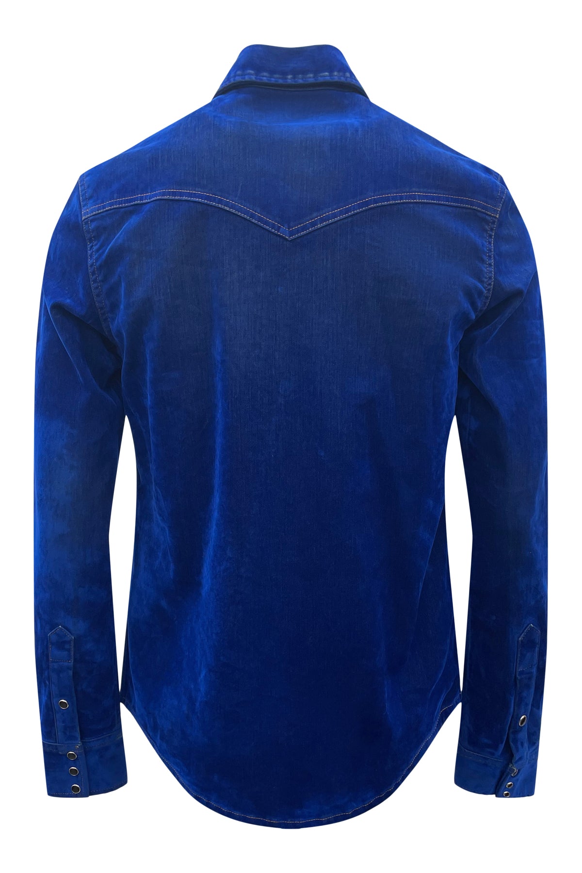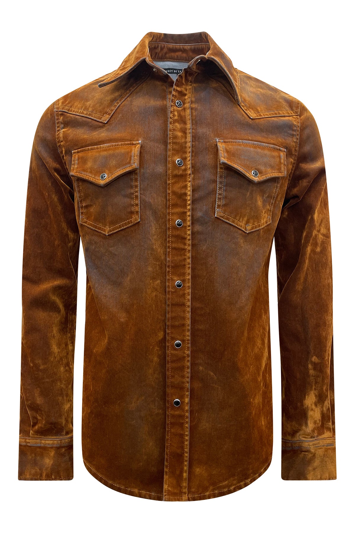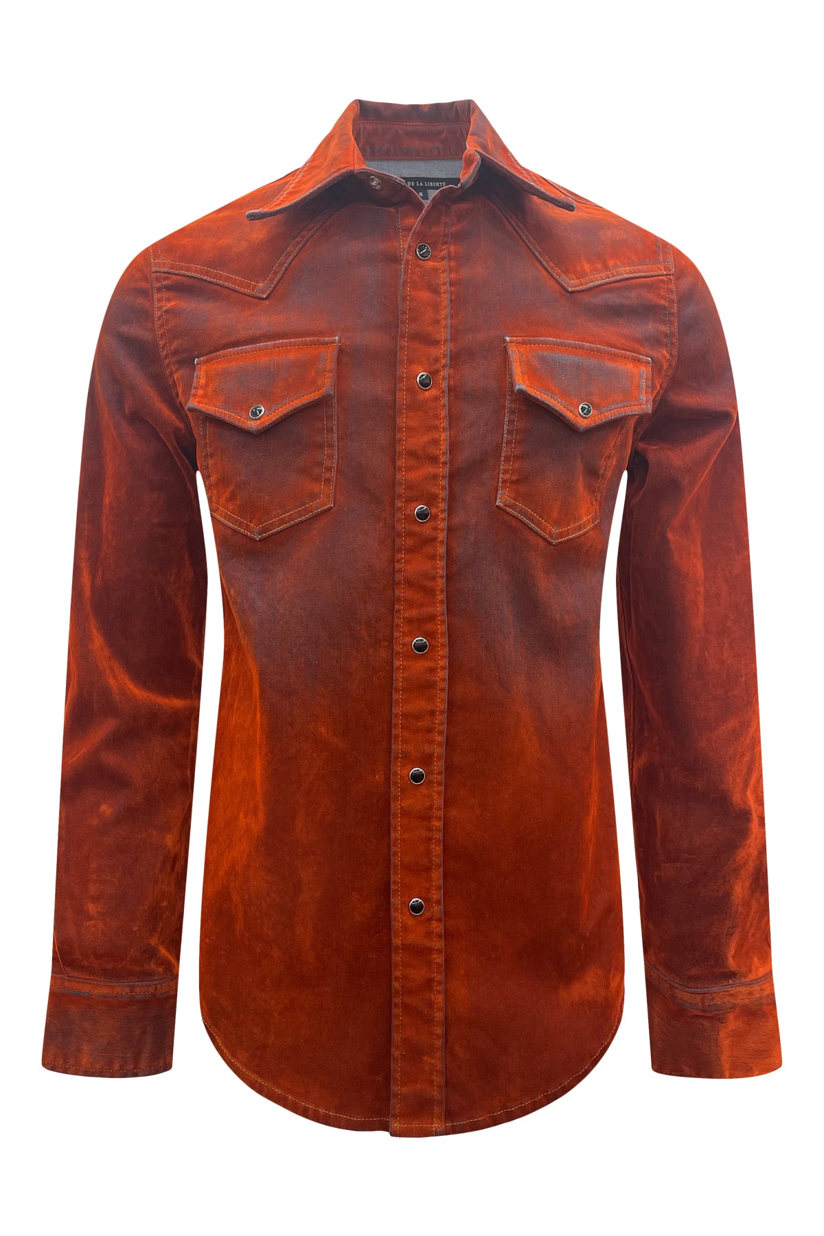 Western Shirt with snap button front closure and snap button flap pockets. Crafted with flock made from 100% viscose and denim consisting of 97% cotton and 3% elastane for a unique and durable design. Premium European fabric. Made in the USA.