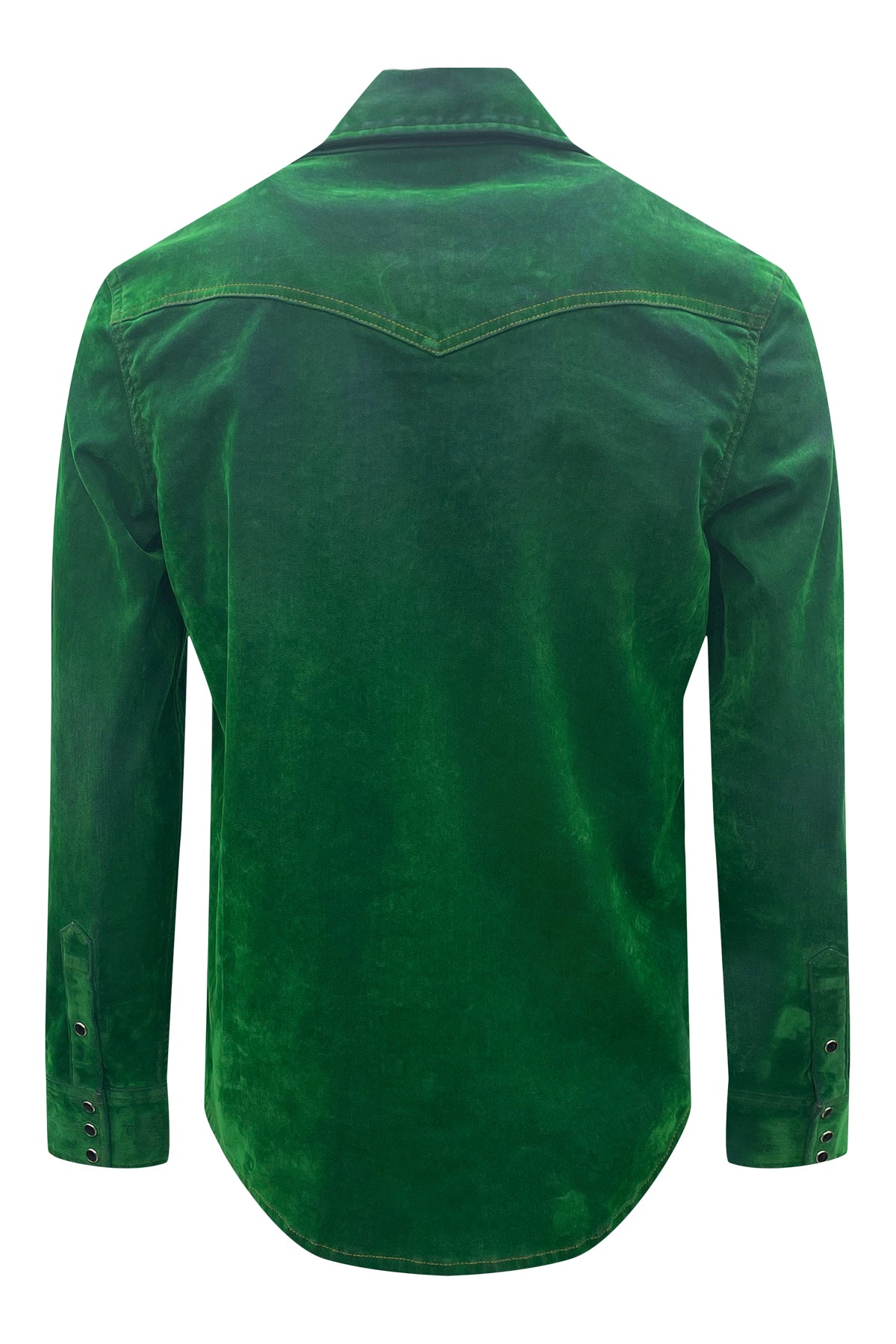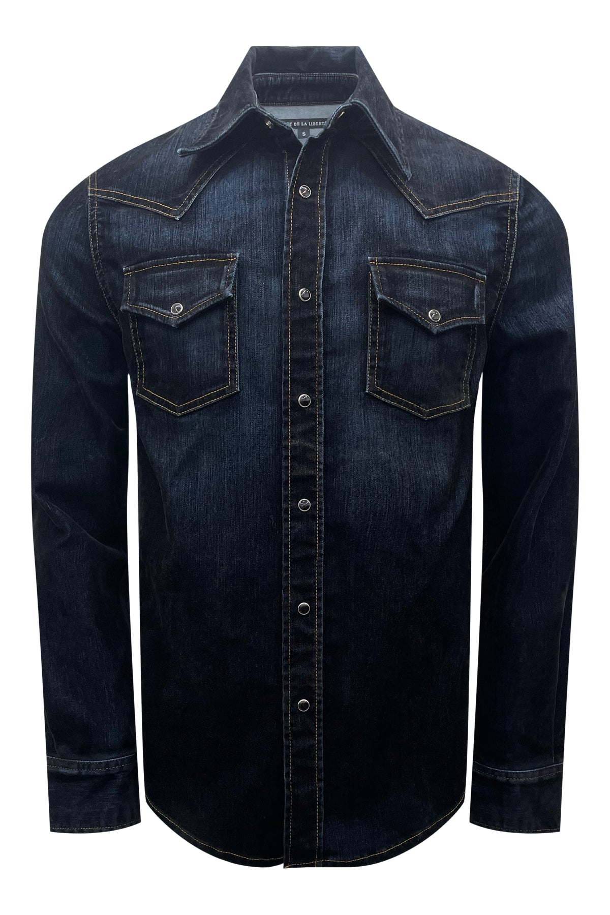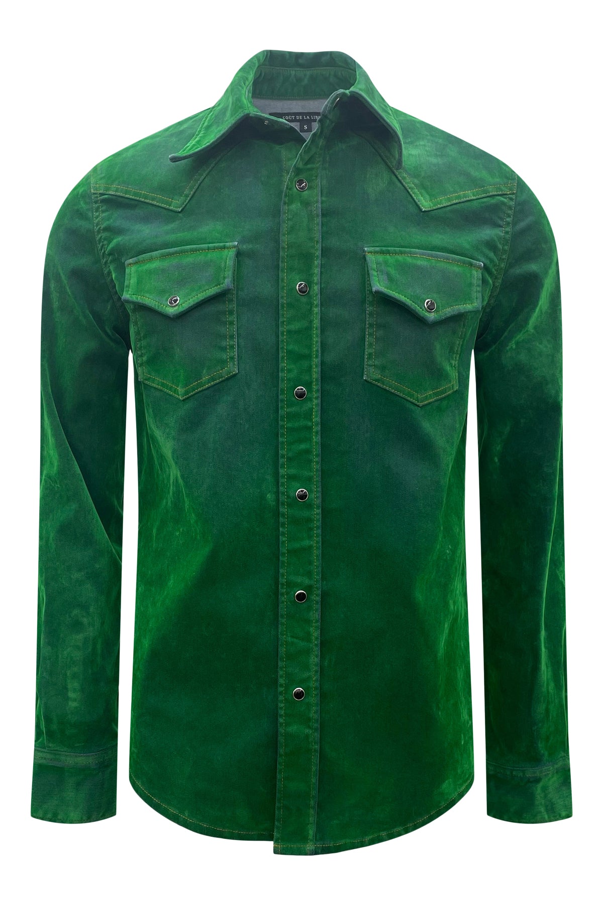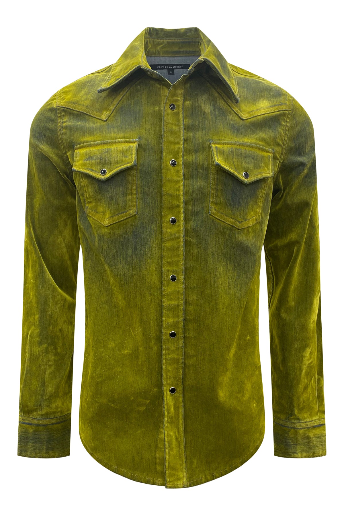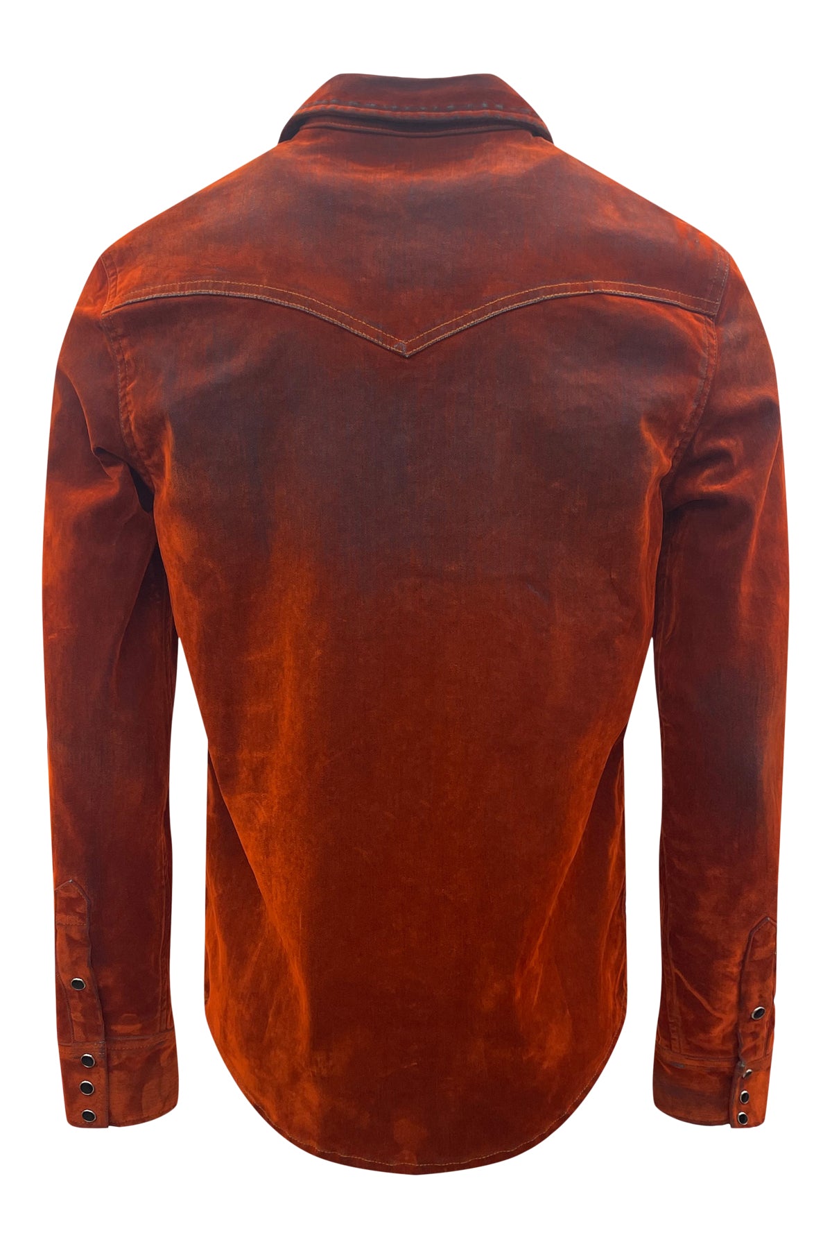Western Shirt with snap button front closure and snap button flap pockets. Crafted with flock made from 100% viscose and denim consisting of 97% cotton and 3% elastane for a unique and durable design. Premium European fabric. Made in the USA.