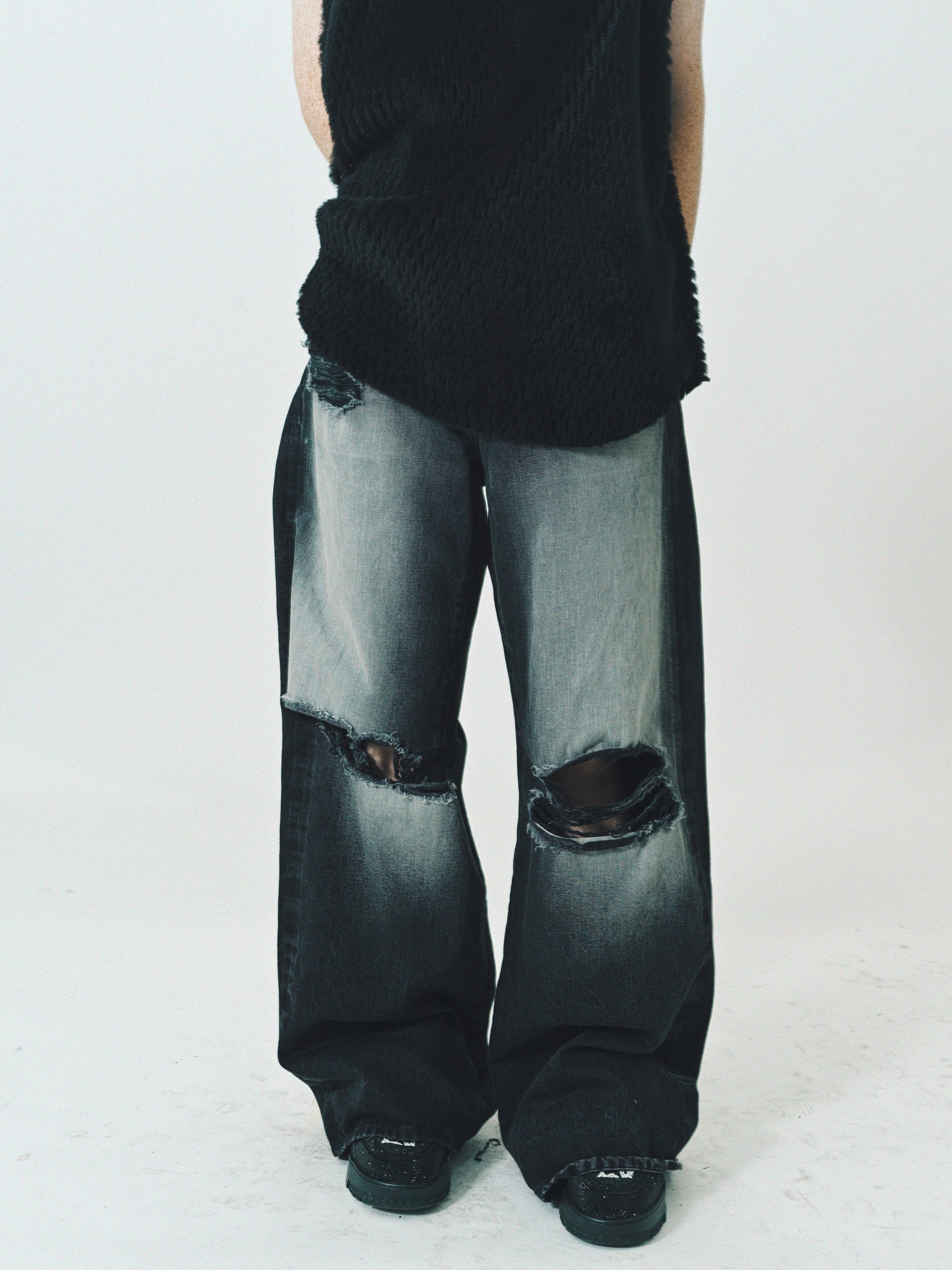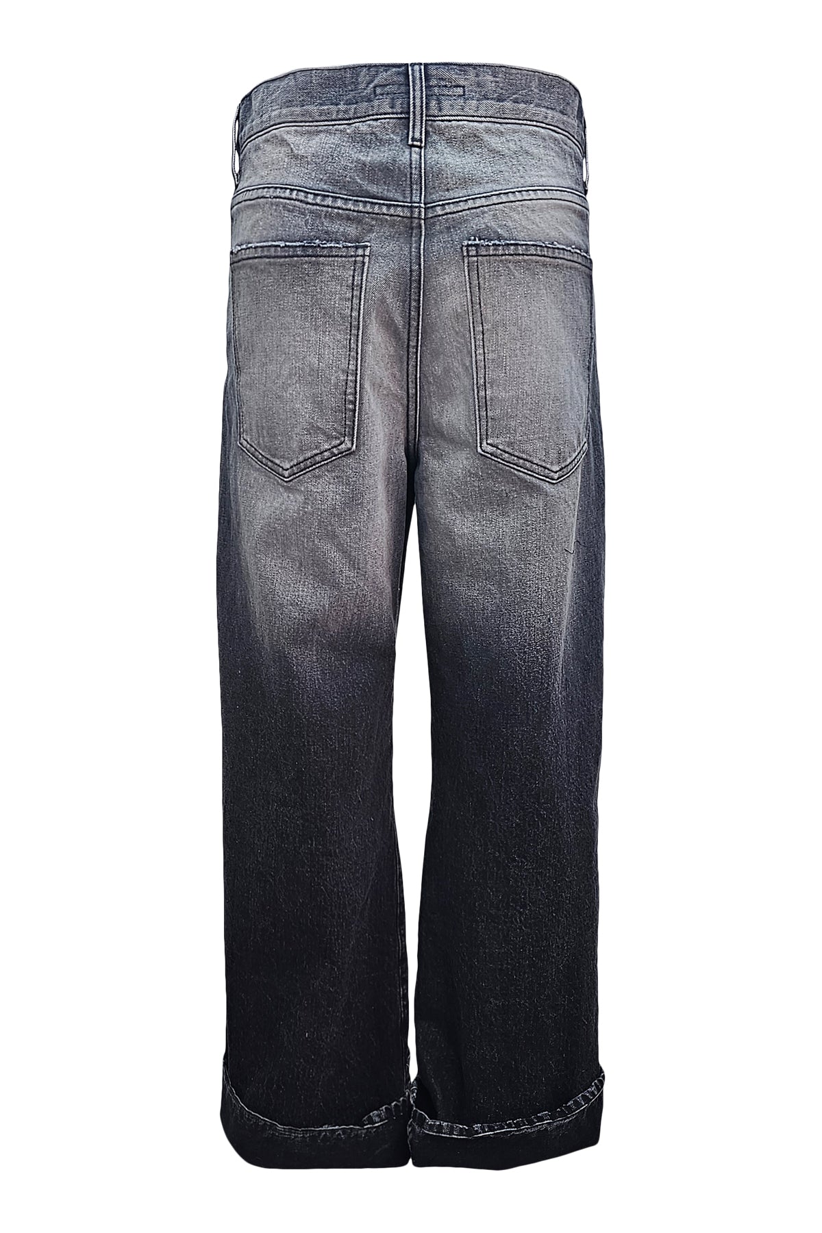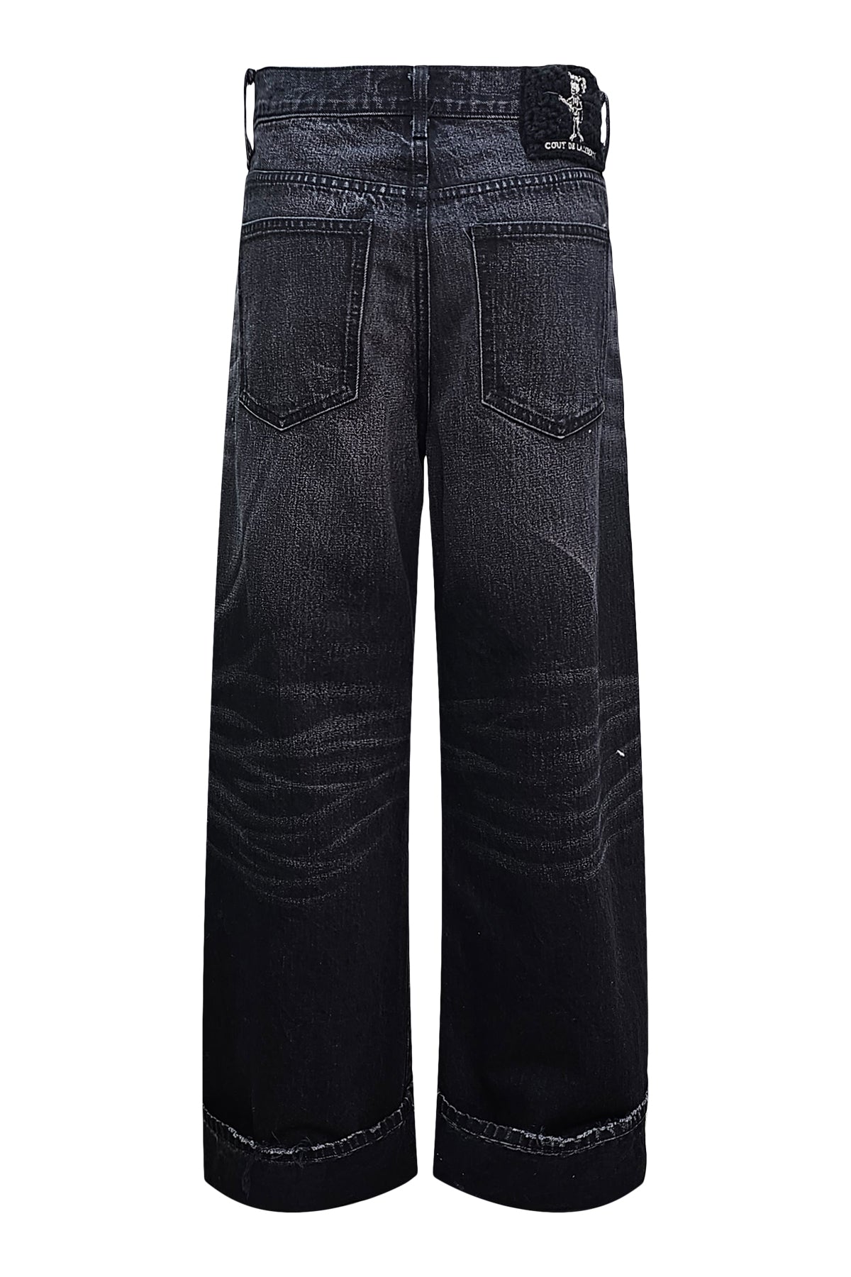 Wide-leg denim jeans with button and zip front closure. Crafted from 100% cotton for a structured fit. Features classic five-pocket styling. Premium European fabric. Made in the USA.