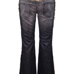 Low-rise flare jeans with button front closure. Crafted from 100% cotton with classic five-pocket styling and a distinctive printed design. Premium European fabric. Made in the USA.