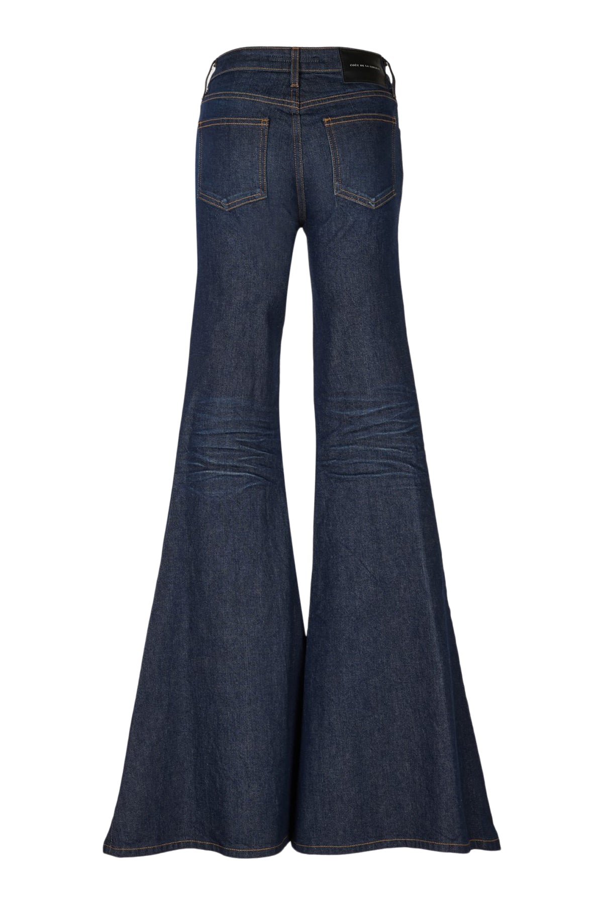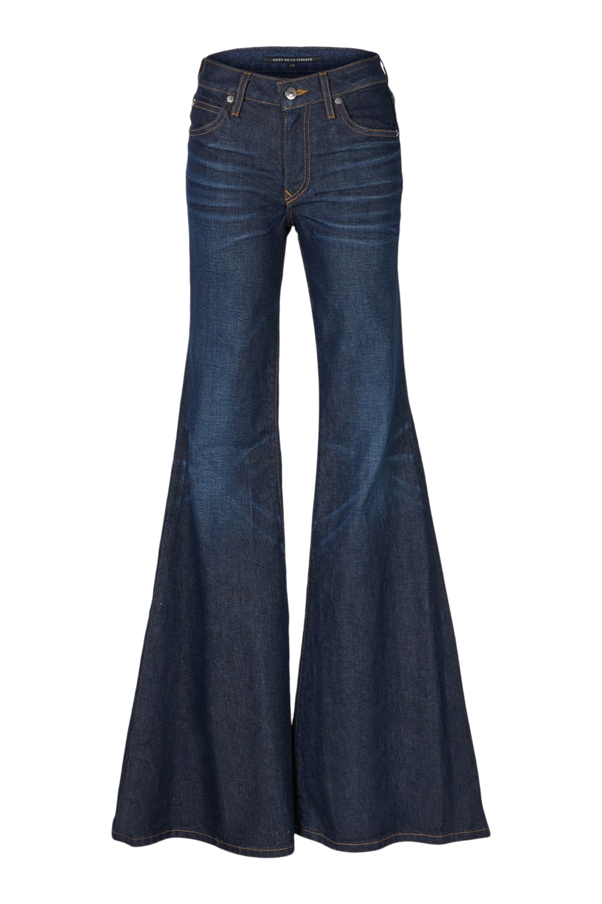 Super high-rise bell-bottom pants with button and zip front closure. Crafted from 98% cotton and 2% elastane for comfort and flexibility. Features five-pocket styling. Premium European fabric. Made in the USA.