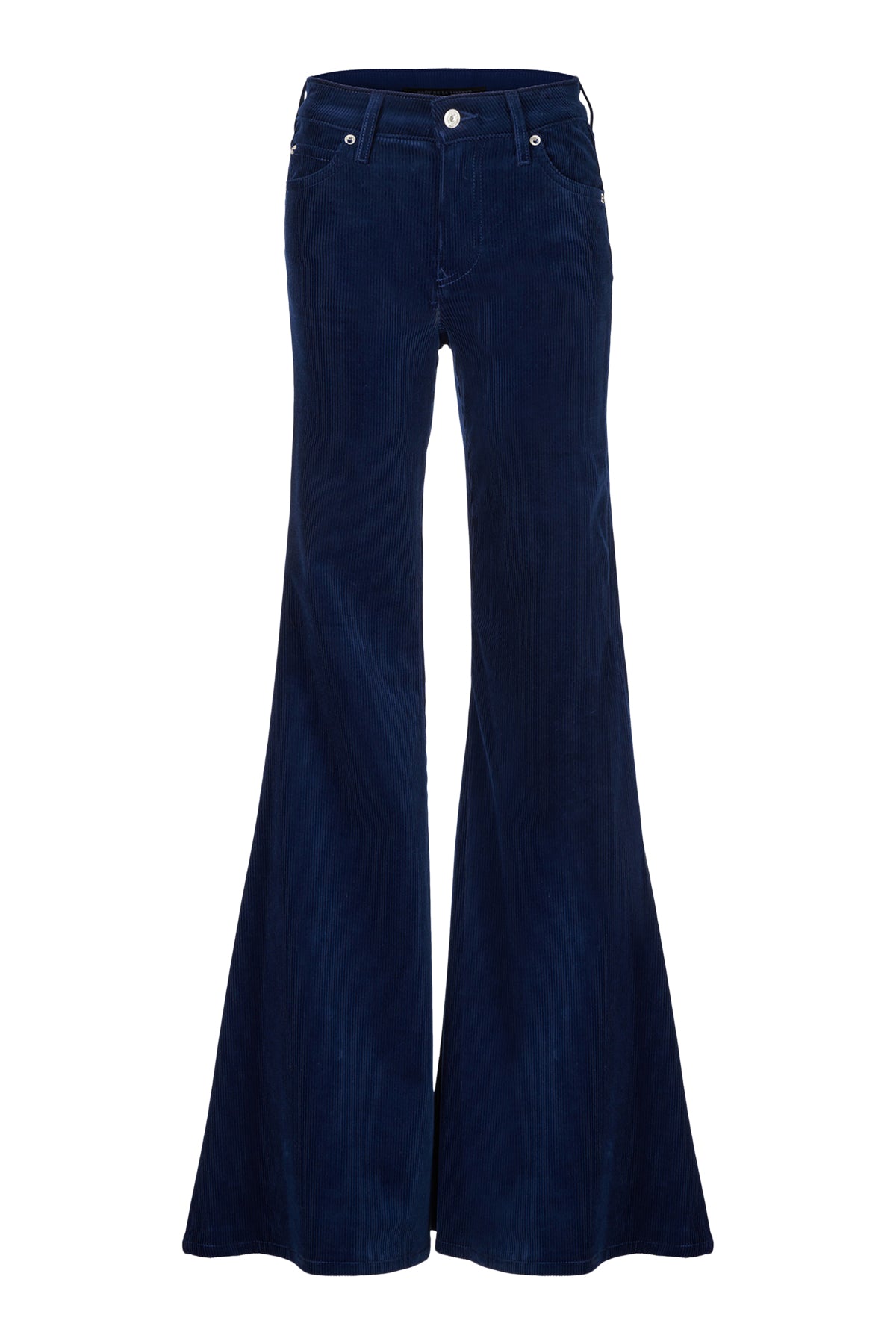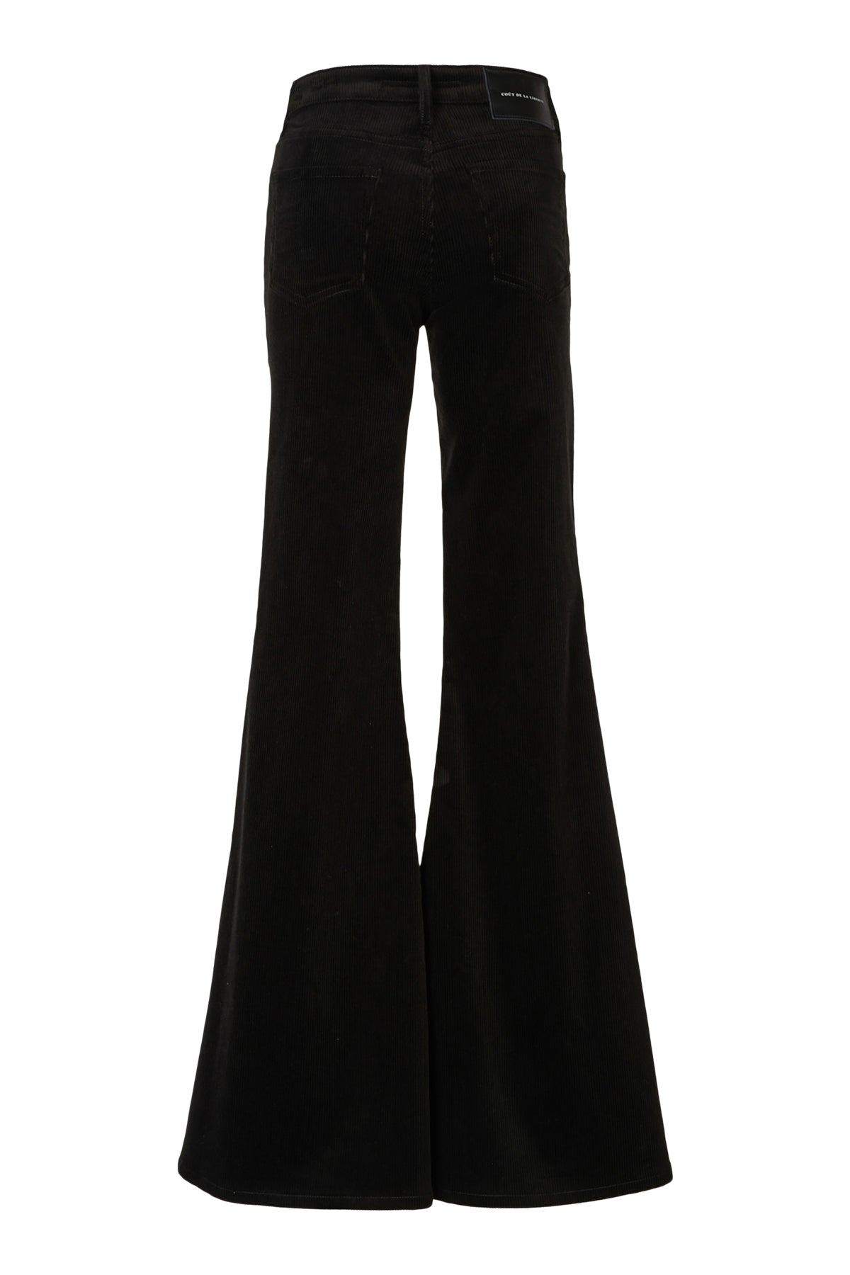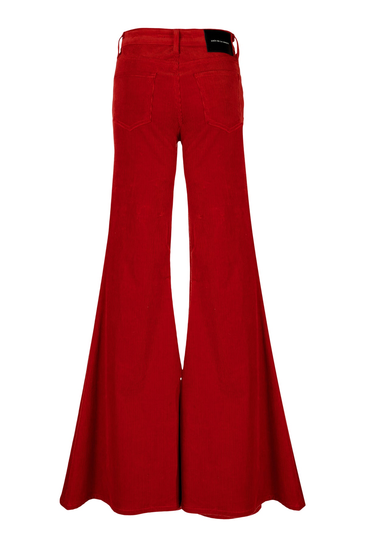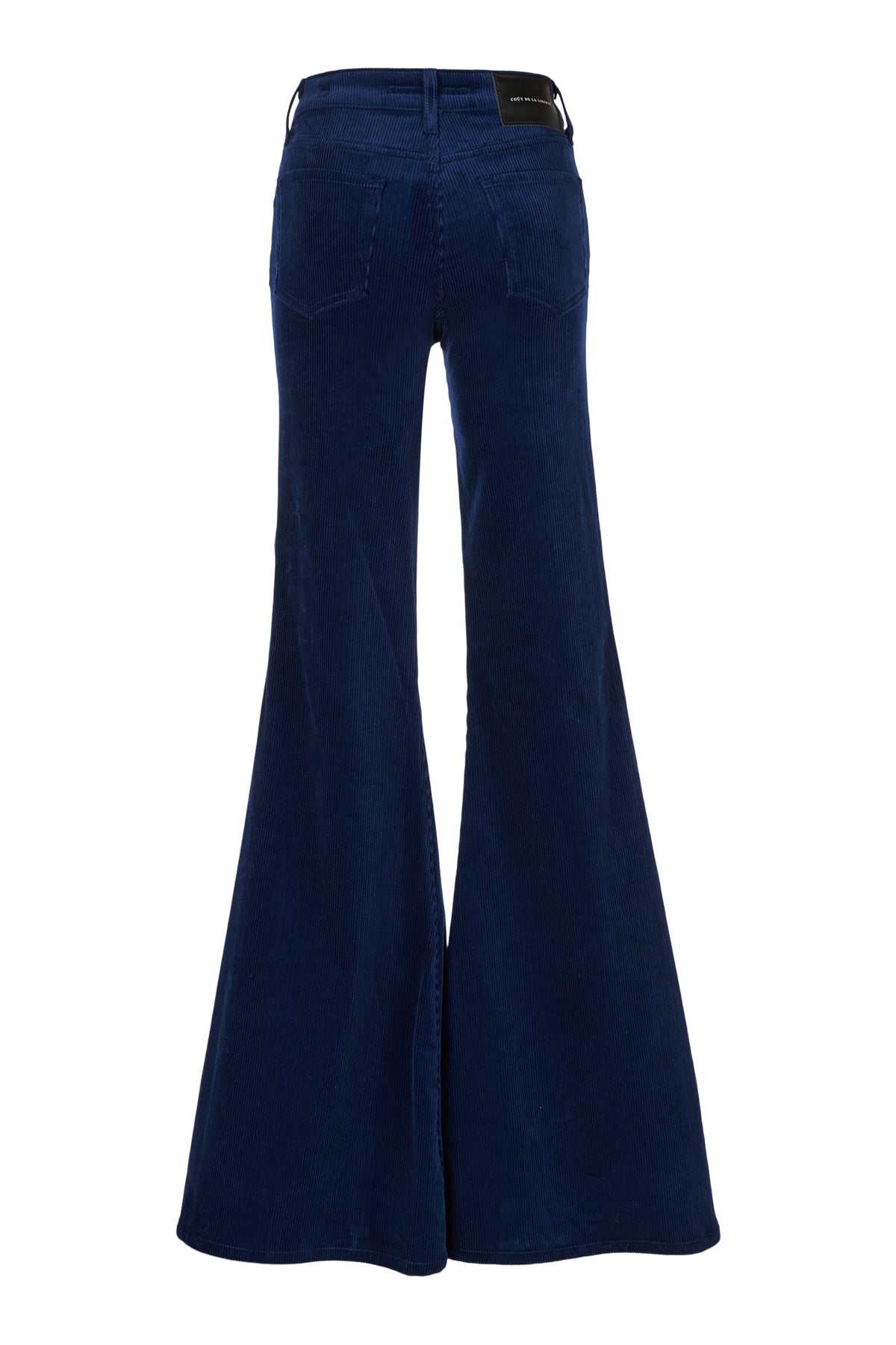 Mid-rise super flare pants with zip and button front closure. Crafted from a blend of 99% cotton and 1% elastane for comfort and flexibility. Features classic five-pocket styling. Premium European fabric. Made in the USA.