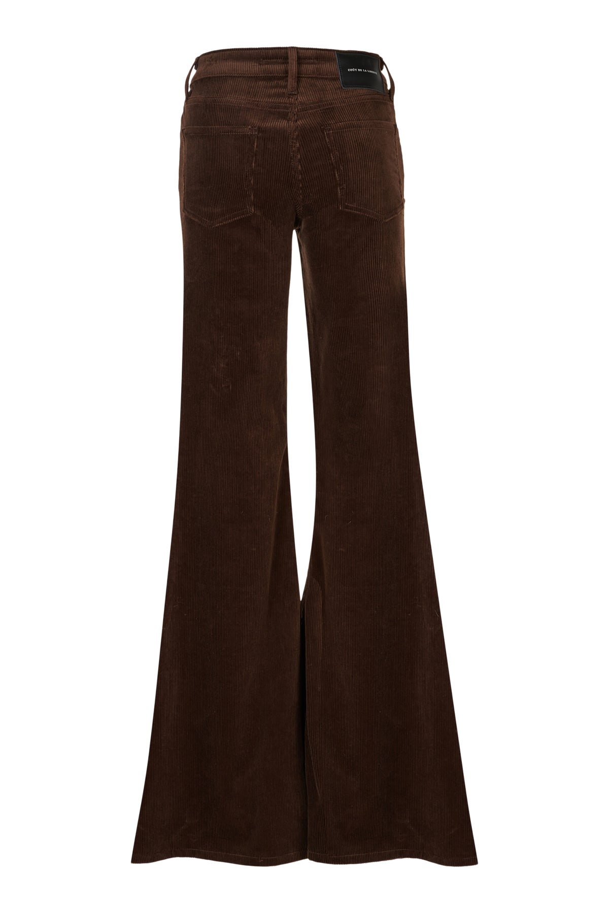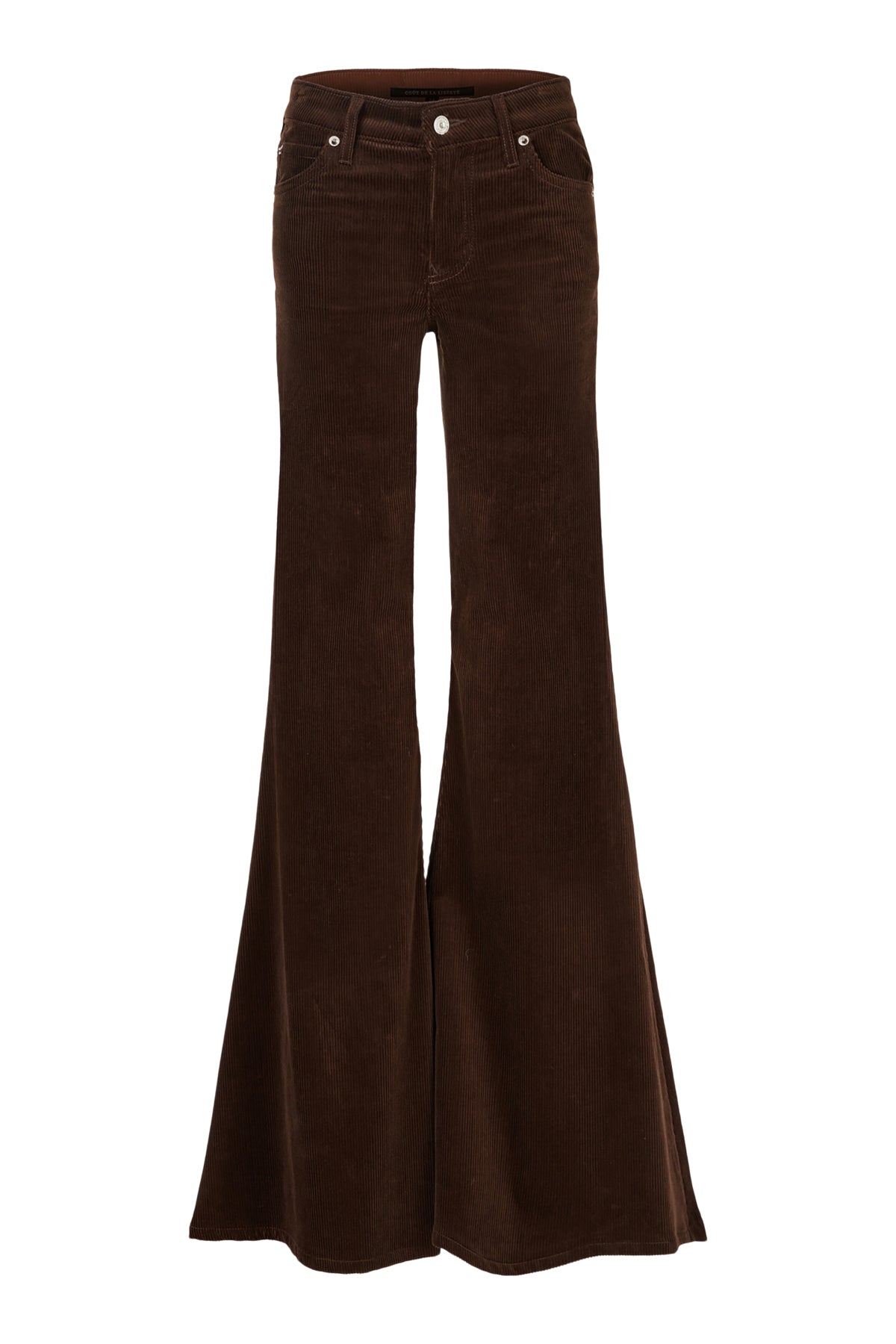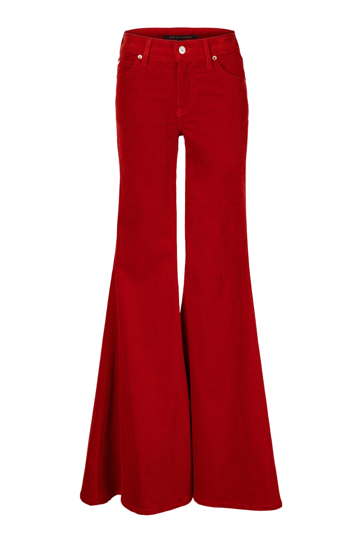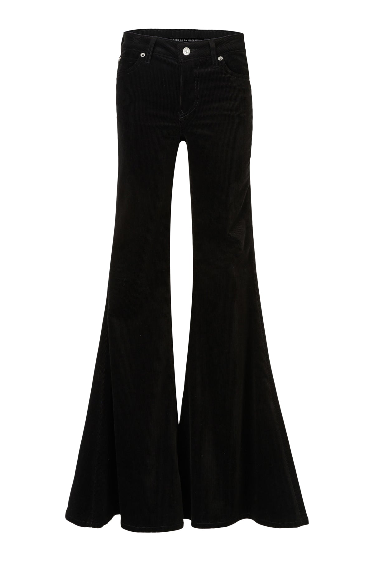 Mid-rise super flare pants with zip and button front closure. Crafted from a blend of 99% cotton and 1% elastane for comfort and flexibility. Features classic five-pocket styling. Premium European fabric. Made in the USA.