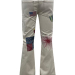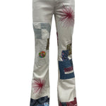 Patchwork Embroidered Low-Rise Flare pants with button front closure and classic five-pocket styling. Crafted from 100% cotton with intricate beading embellishments for a unique and standout design. Premium European fabric. Made in the USA.