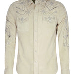 Western Shirt with snap button front closure and snap button flap pockets. Crafted from 100% lambskin with studs embellishments for a bold and luxurious design. Premium European fabric. Made in the USA.