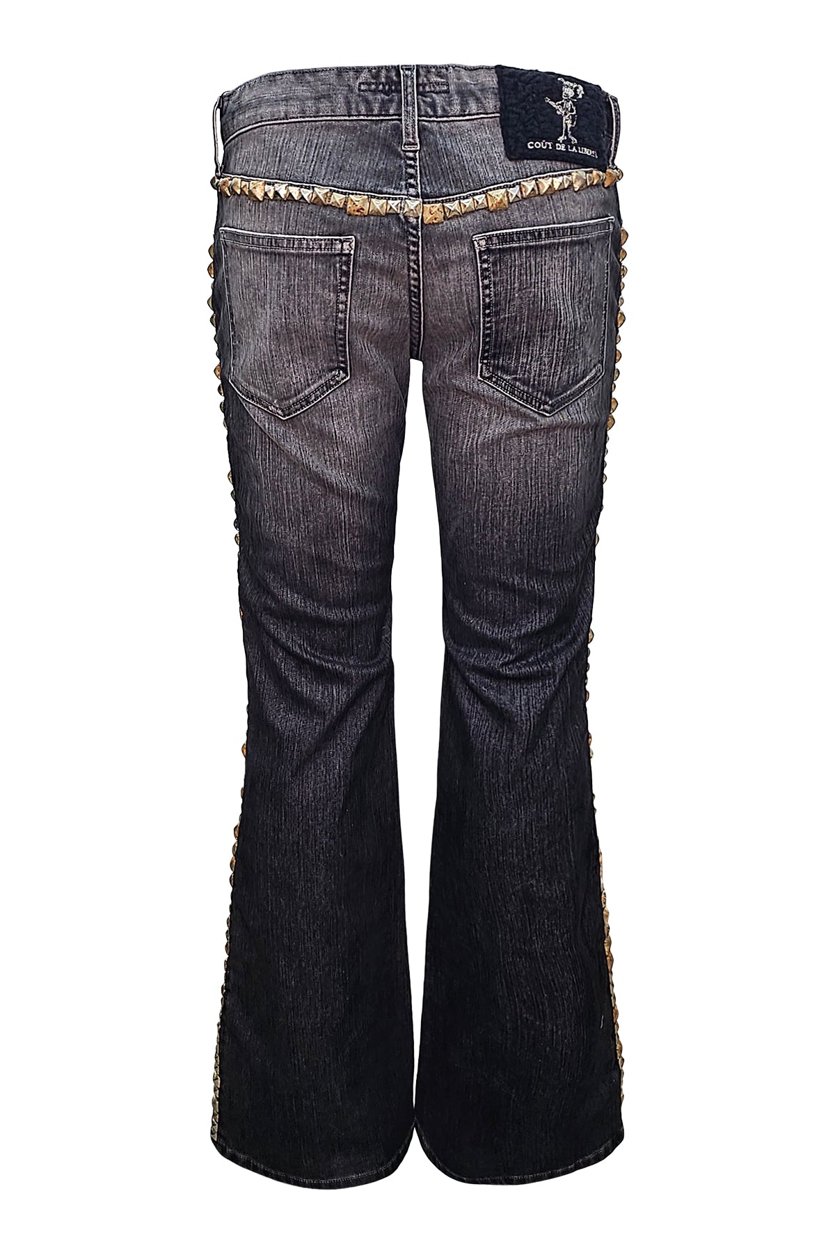 Low-rise flare jeans with button front closure. Crafted from 100% cotton with classic five-pocket styling and a distinctive printed design. Premium European fabric. Made in the USA.