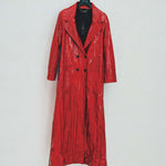 Kellen Eel Trench Coat with button front closure and classic flap pockets. Crafted from 100% exquisite eel skin in a striking red hue for a luxurious and bold design. Premium European fabric. Made in the USA.