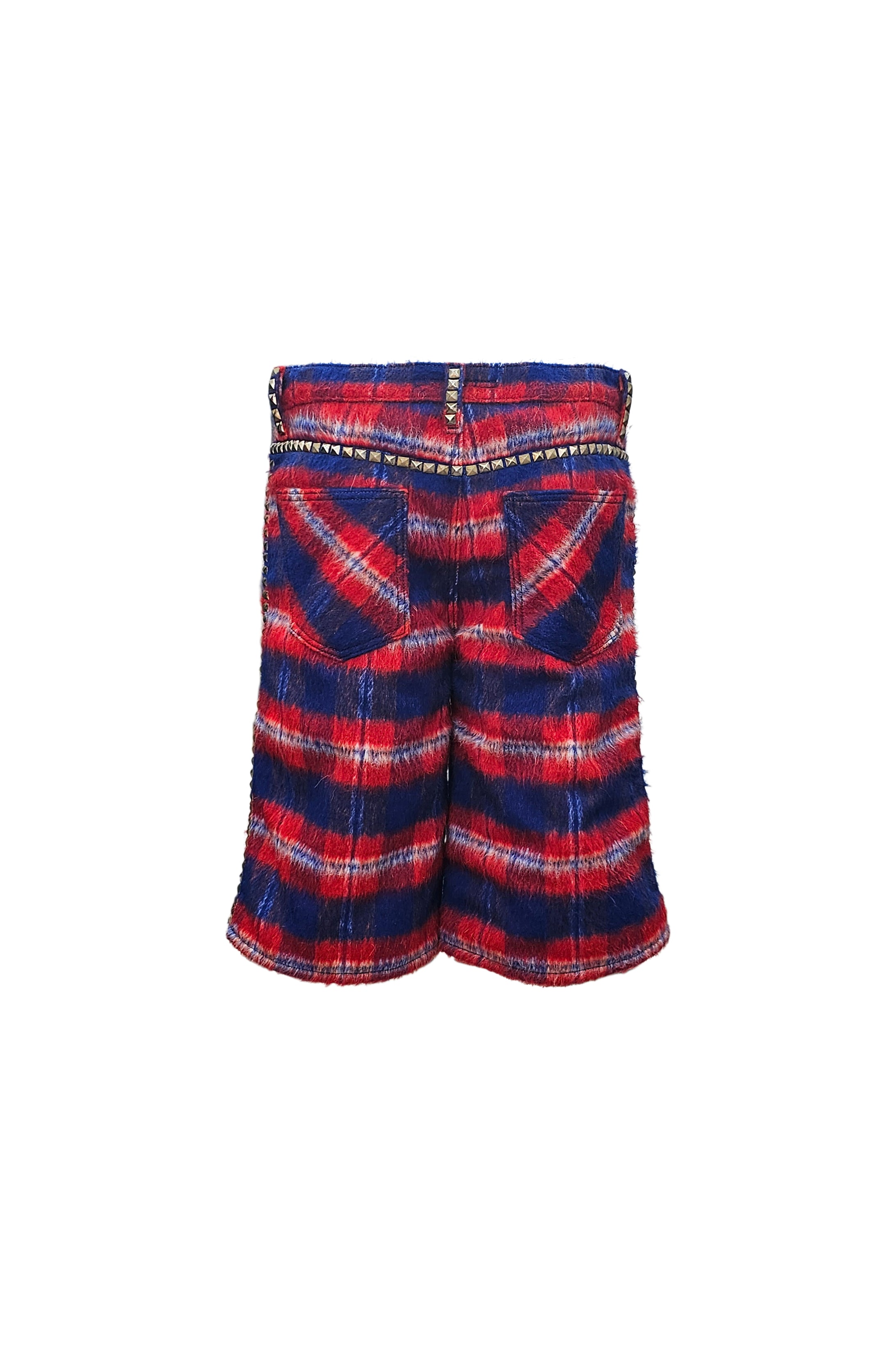 Baggy shorts with button and zip front closure. Features embellished wool detailing for a unique and textured style. Designed with a relaxed fit and classic five-pocket styling for practicality. Premium European fabric. Made in the USA.